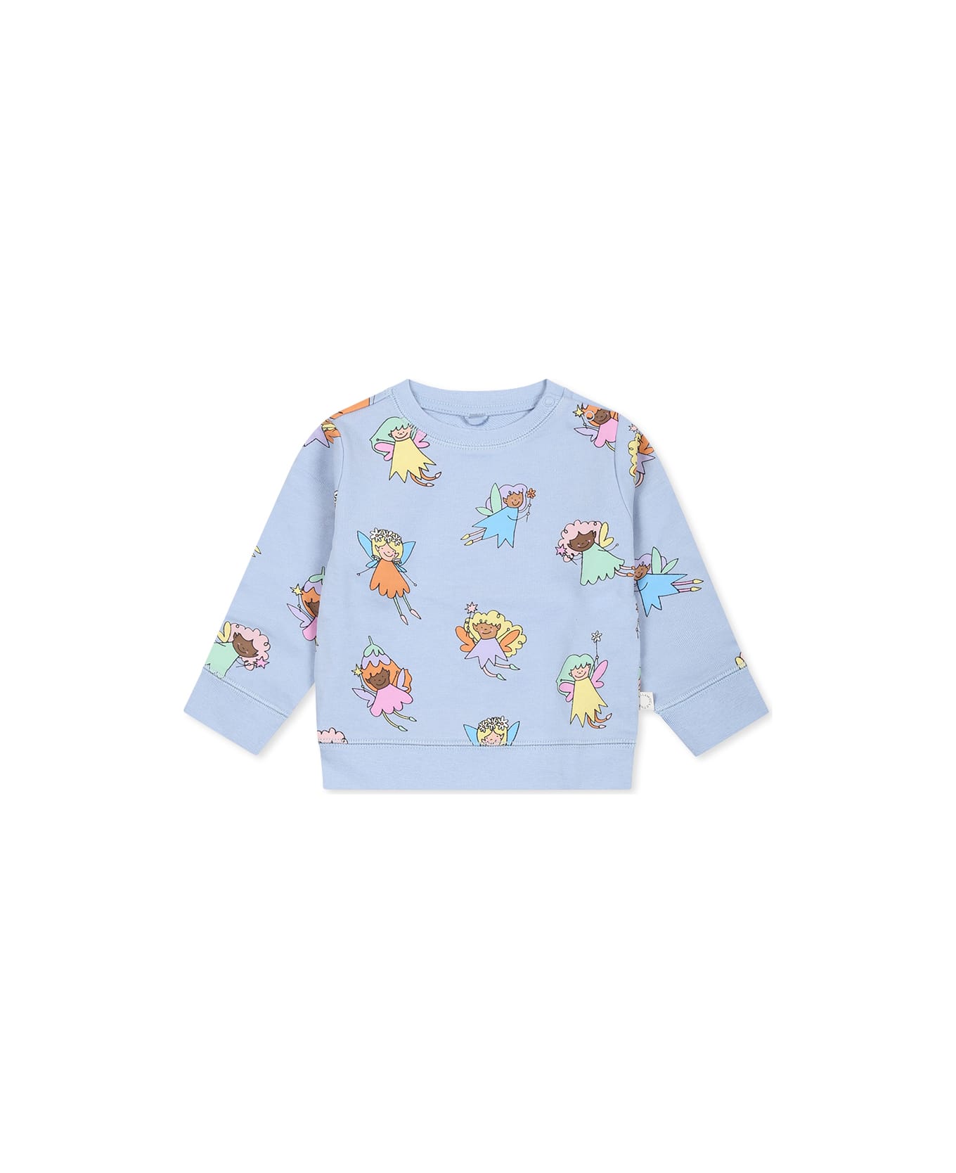 Light blue sweatshirt in GOTS certified organic brushed cotton, long sleeves, with ribbed crew neck, cuffs and hem and snap button fastening on the shoulder. It is embellished with all-over fairy print.