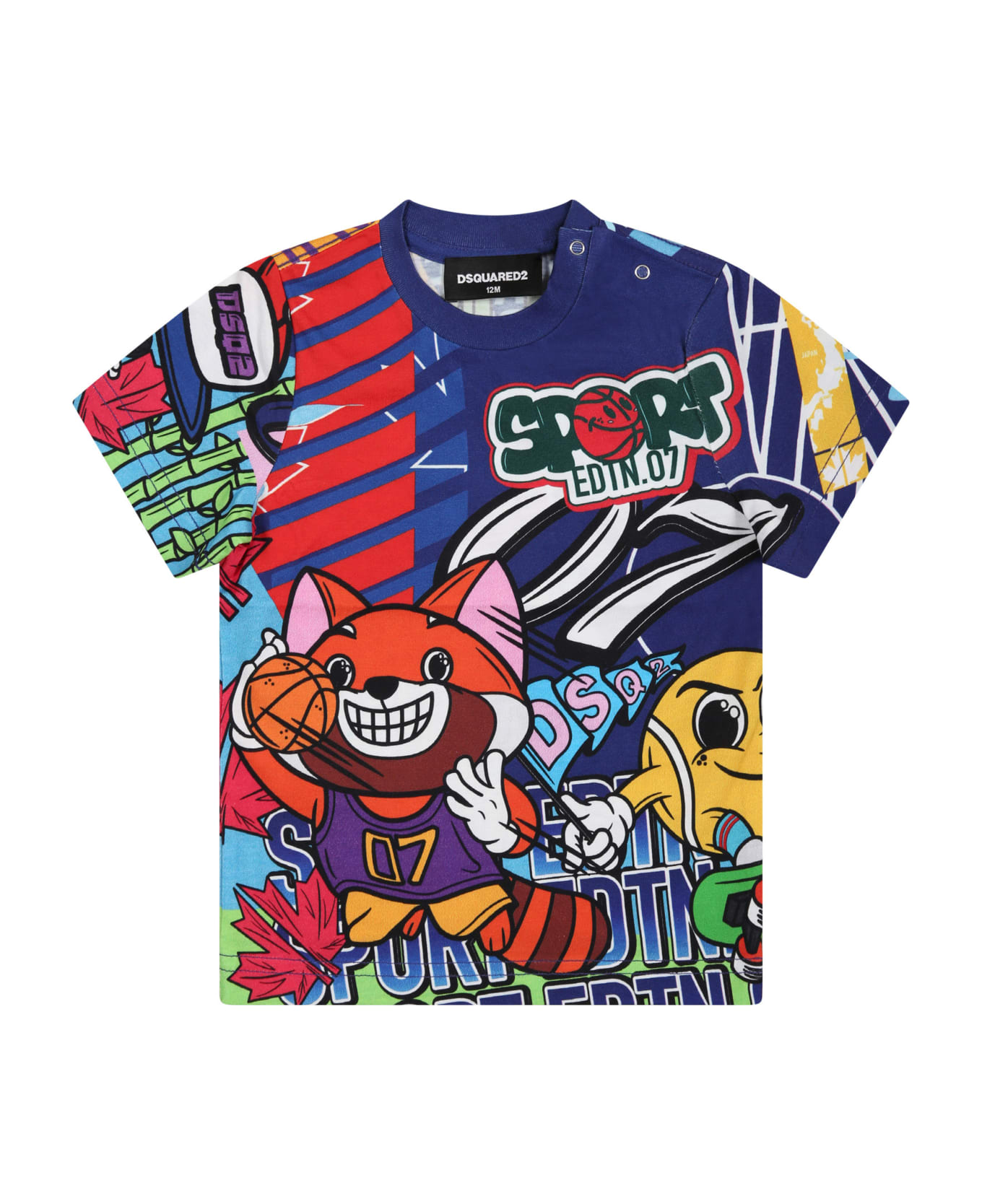 Blue t-shirt, in cotton, with short sleeves, ribbed crewneck, closure with automatic buttons on the chest. It is embellished with all-over Shibuya print and logo.