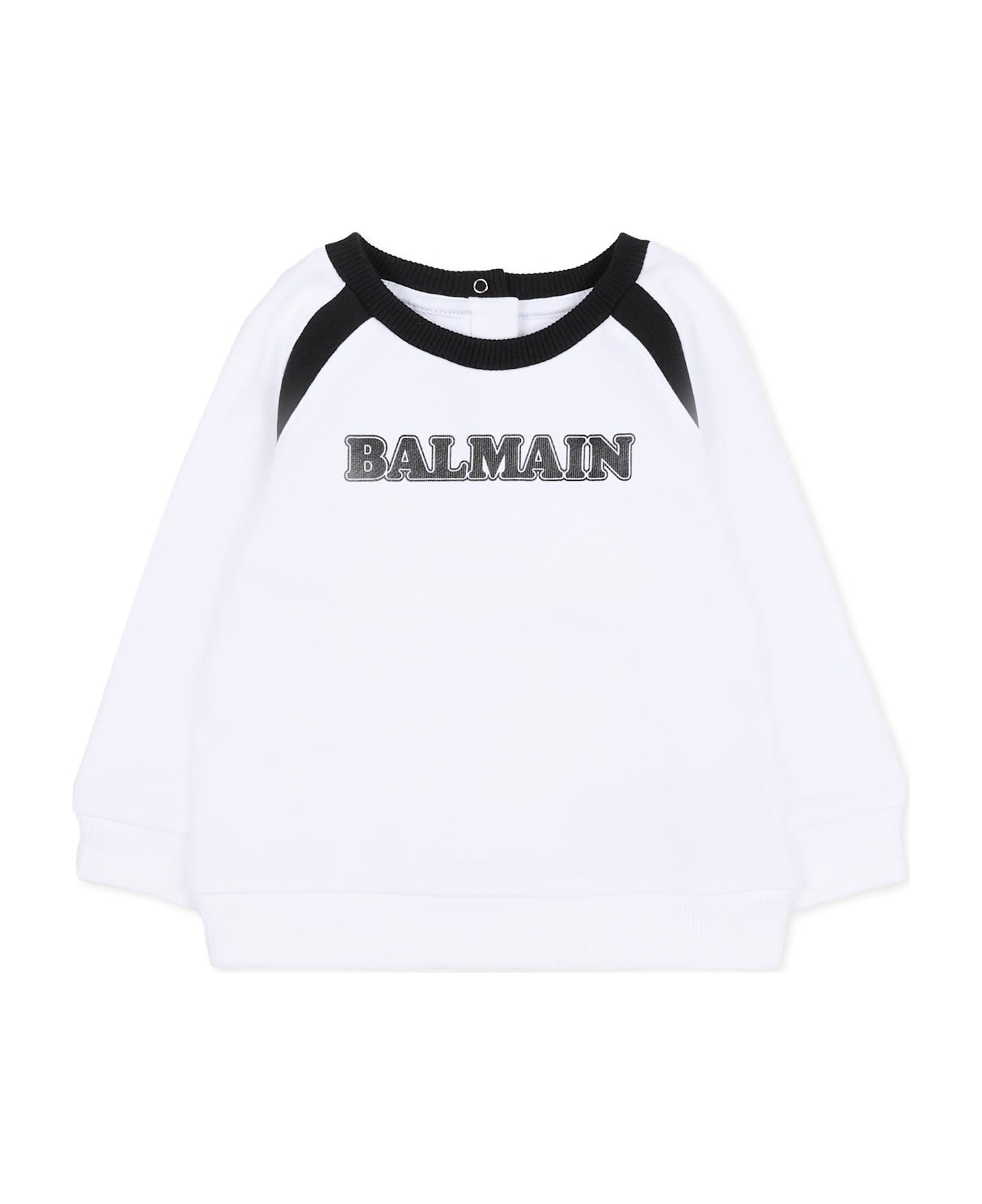 White, long-sleeved, organic cotton sweatshirt with a black crew neck, snap button closure on the back, black details on the front and back, and ribbed cuffs and hem. It is embellished with a contrasting black logo on the front.