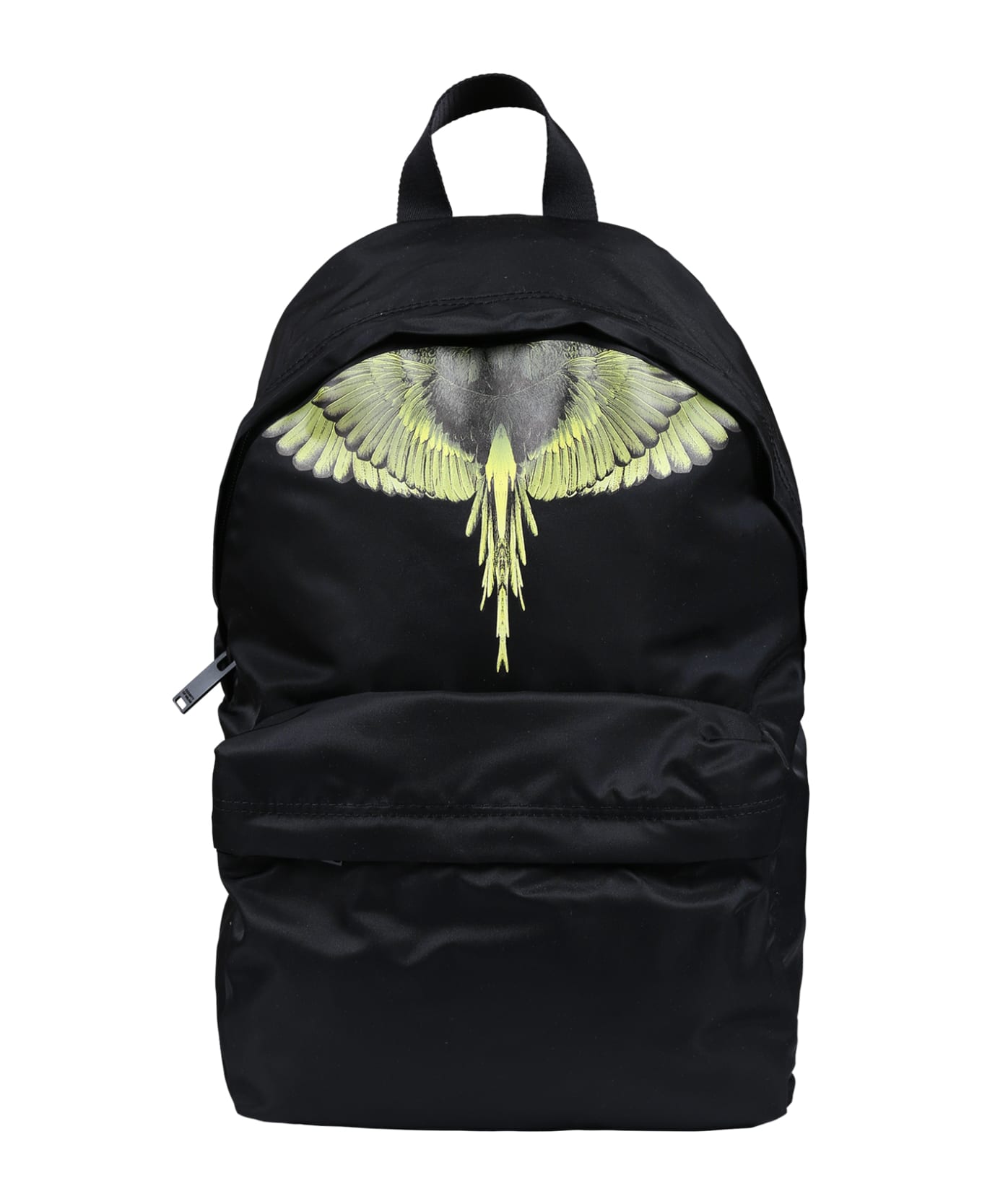 Black backpack, with frontal zipped pocket, closure with zip and adjustable shoulder straps, on the back. It is embellished with yellow iconic wings, on the front. 40 x 29 x 19 cm.
