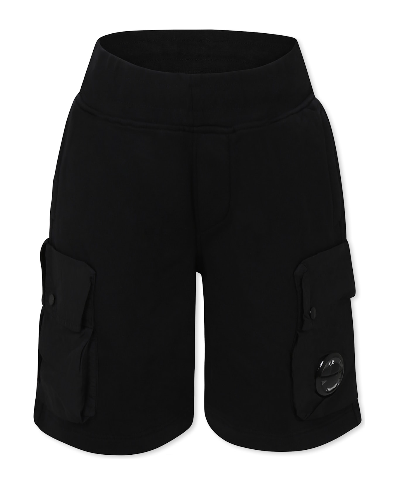 Black shorts in brushed cotton, with elasticated waist, internal drawstring, side pockets and cargo pockets on the sides. They are embellished with a logo lens applied on one side.