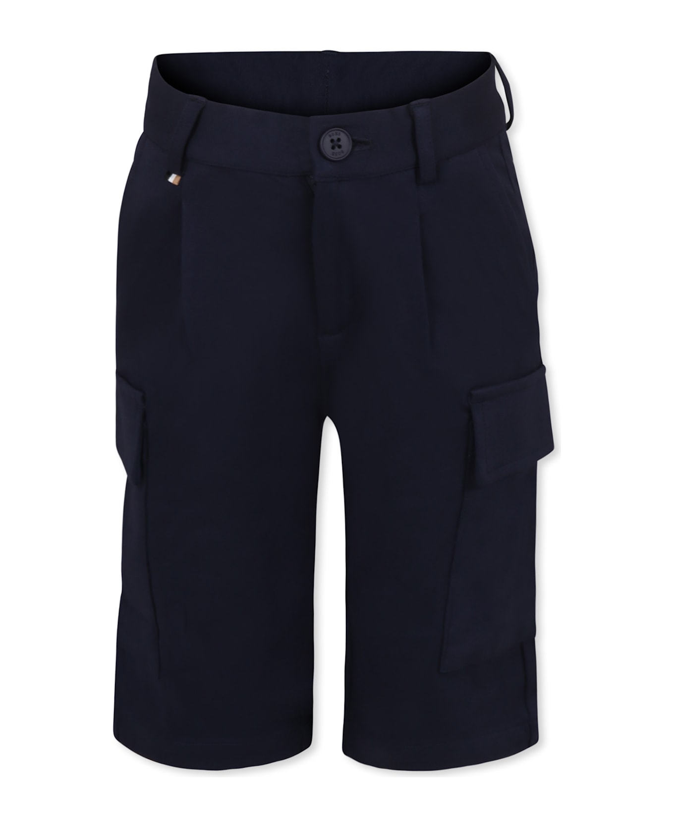 Blue shorts with belt loops, front zip and button fastening, adjustable waist thanks to internal elastic with buttons, side pockets, back pockets and flap pockets on the sides. They are embellished with tricolour patch on the front.