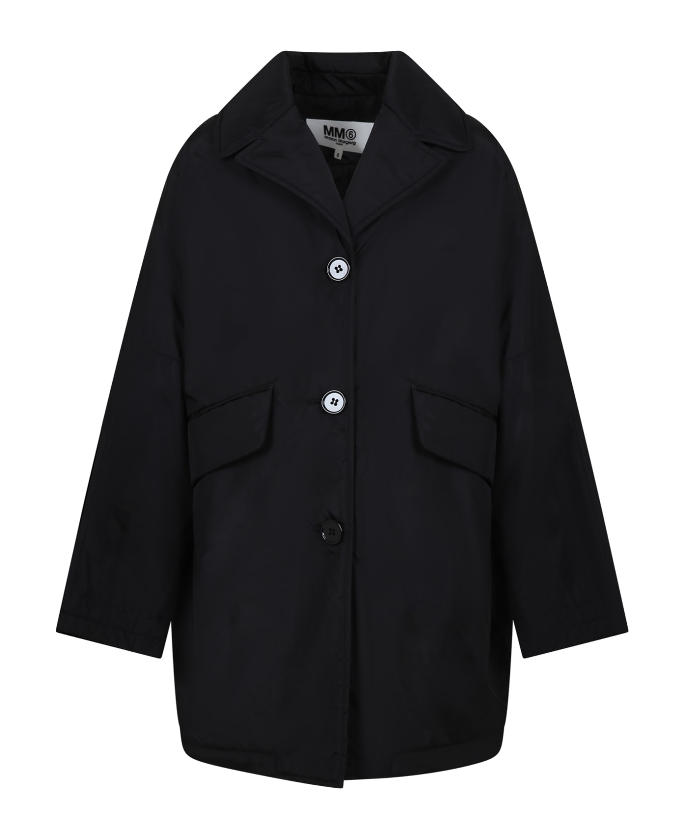 Lightly padded black coat in cotton, with long sleeves, lapel collar, front closure with buttons, side pockets with flap. It is embellished with logo embroidered on the sleeve.