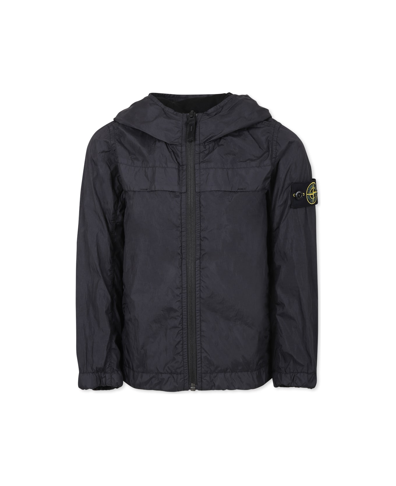 Black jacket, long sleeves, with hood, front zip fastening, side pockets with snap button and elasticated cuffs. It is embellished with iconic compass patch and logo applied on the sleeve.