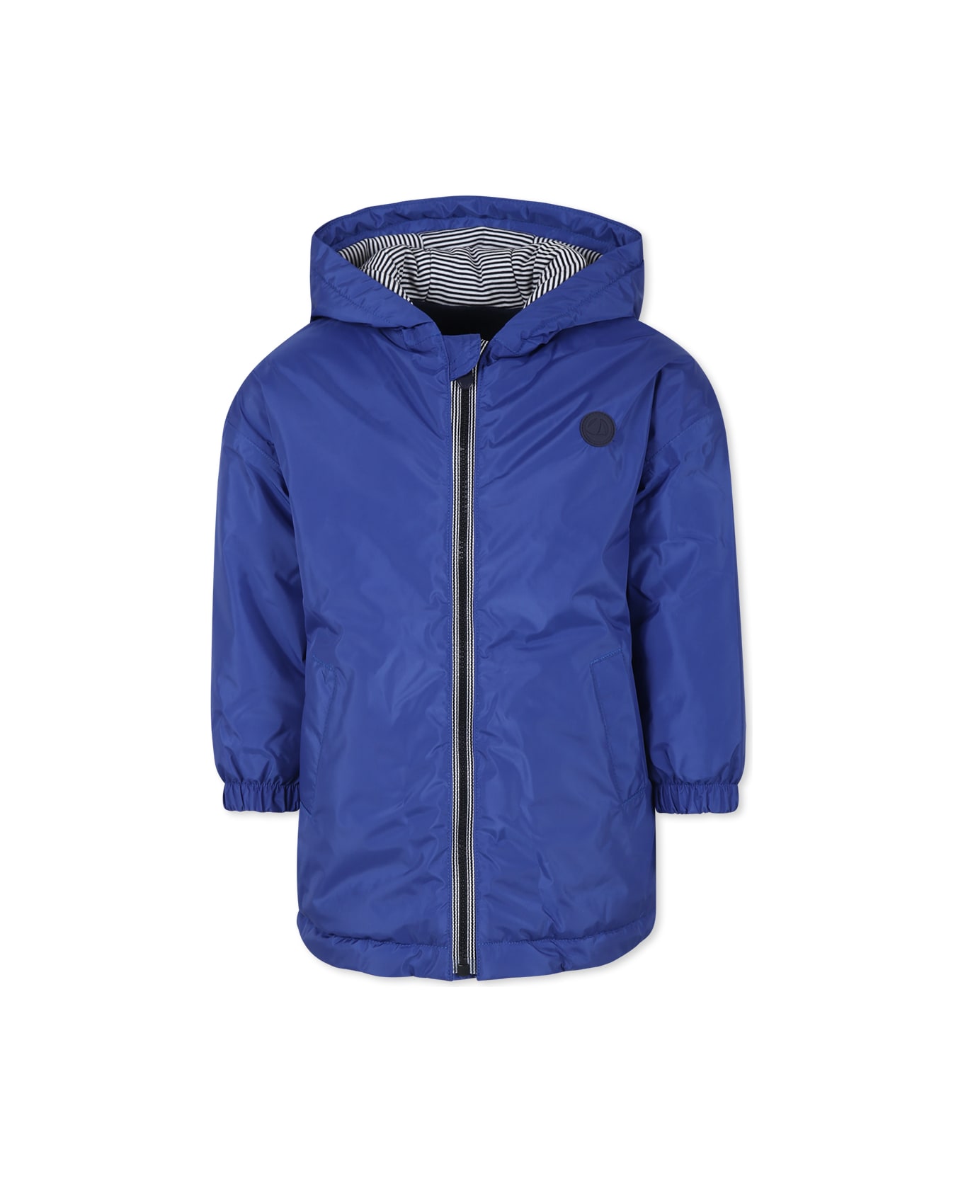 Light blue windbreaker in recycled polyester, lightly padded, with long sleeves, hood with striped pattern inside, front zip closure, side pockets, elasticated cuffs and micro fleece lining. It is embellished with a rubberized logo patch on the chest.