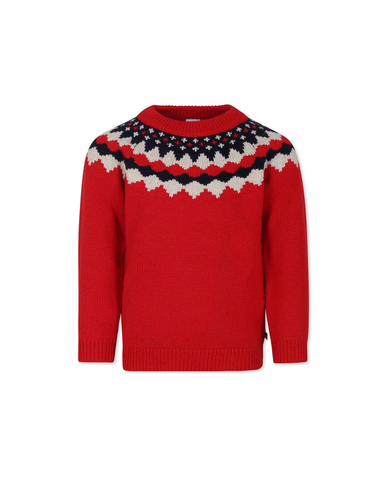 Red wool blend sweater, long sleeves, ribbed crew neck, front button fastening, ribbed cuffs and hem. It is embellished with jacquard pattern on the front and back; made from premium wool and respectful of animal welfare.