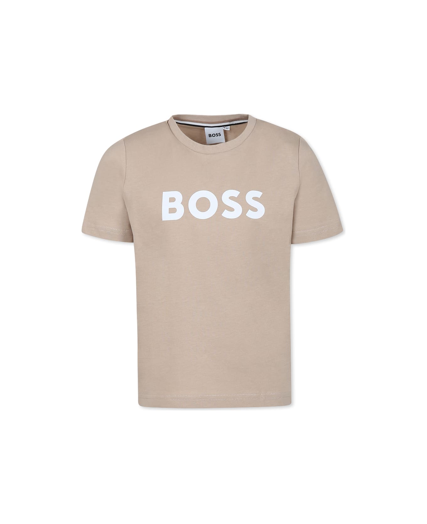 Beige cotton t-shirt, with short sleeves and ribbed crew neck. It is embellished with white logo printed on the front.