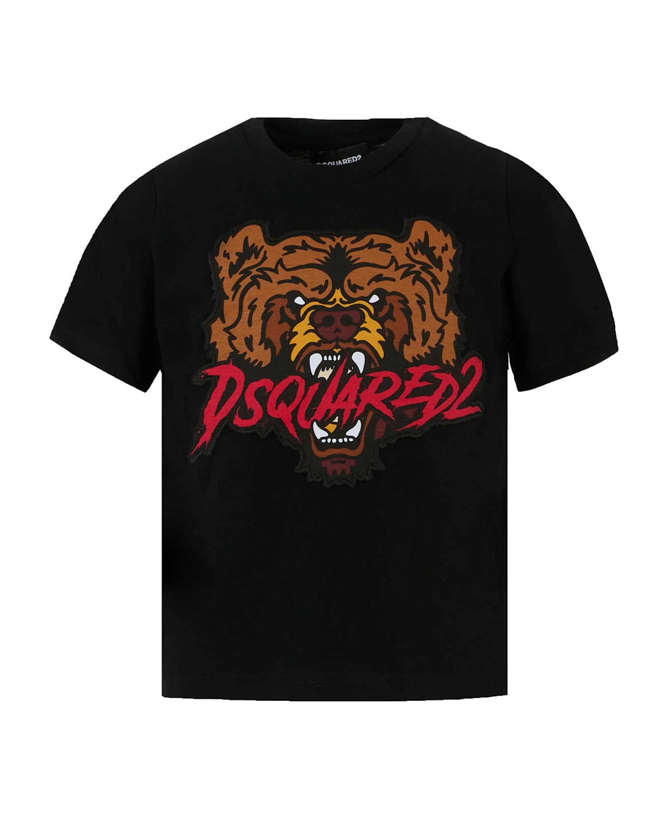 Black cotton t-shirt, with short sleeves and ribbed crew neck. It is embellished with bear-shaped patches and logo, on the front.