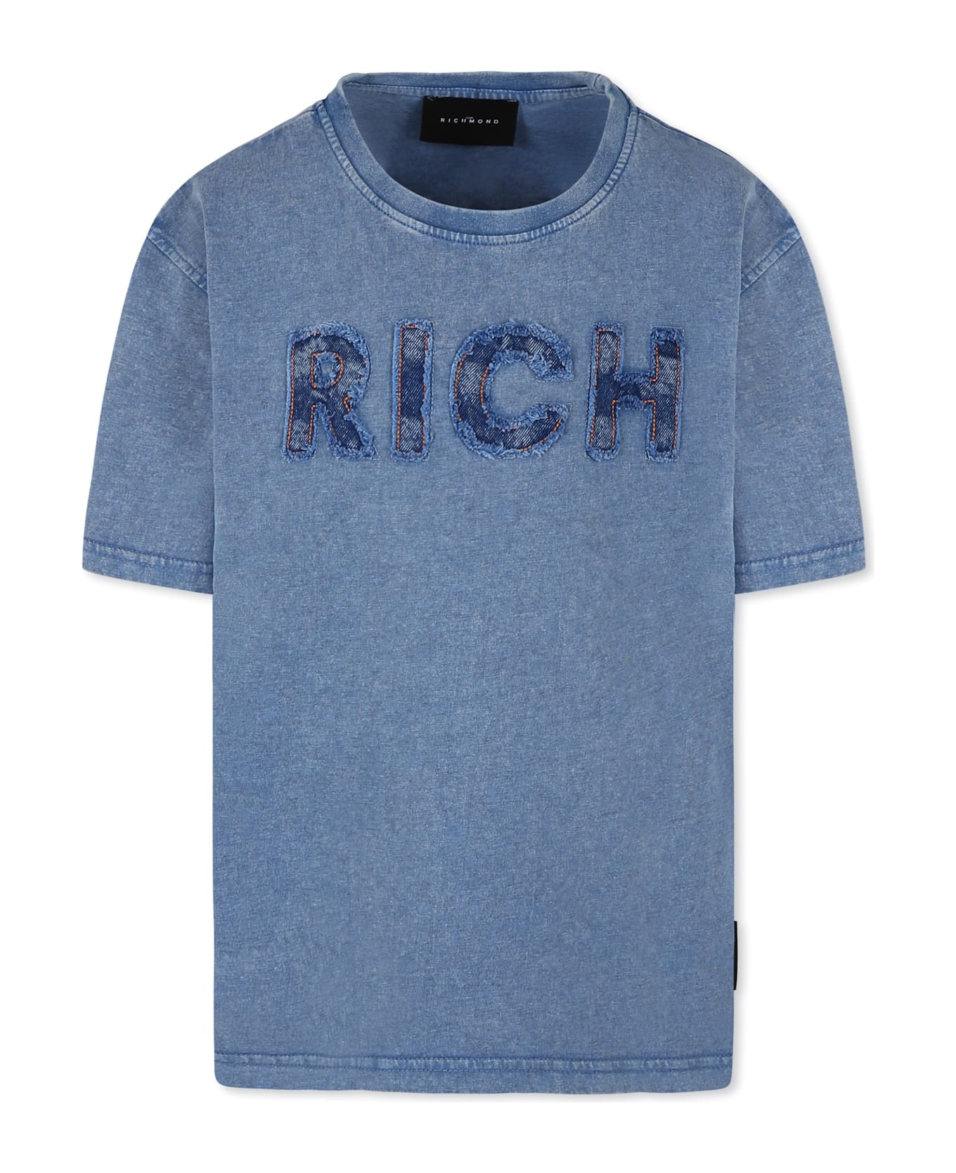 Light blue cotton t-shirt with short sleeves and ribbed crew neck. It is embellished with denim logo with fringes on the front and logo on the back.