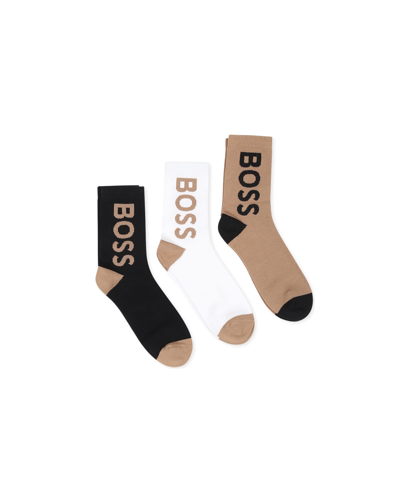Beige sock set composed of three pairs of socks, beige, black and white, with ribbed hem. They are embellished with a jacquard logo on the side.