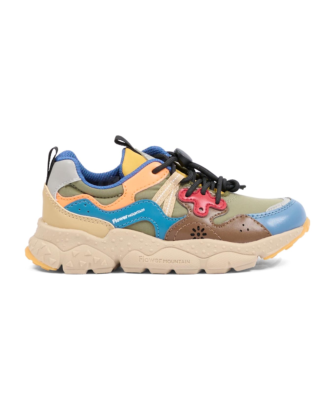 Multicolor vegan sneakers made of fabric and eco-leather with a non-slip rubber sole. The dynamic design features overlapping details in shades of blue, green, beige, orange, and red. They feature a lace-up and drawstring closure and a comfortable pull tab at the back for easy on and off. They are decorated with a logo on one side. This item is a Flower Mountain x Naturino collaboration.