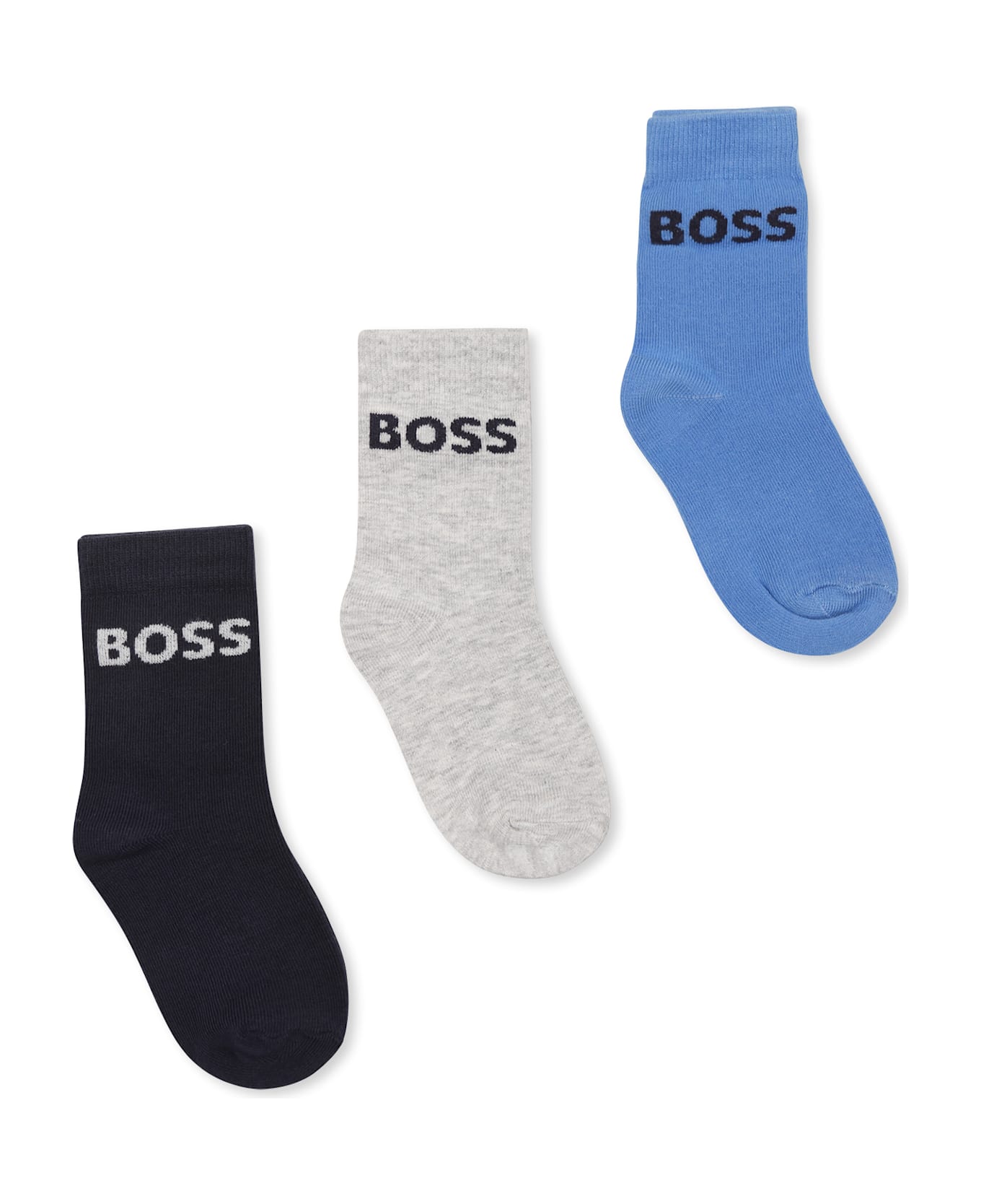 Multicolor sock set, composed of three pairs of socks, light blue, grey and blue, with ribbed hem; embellished with logo on the sides.