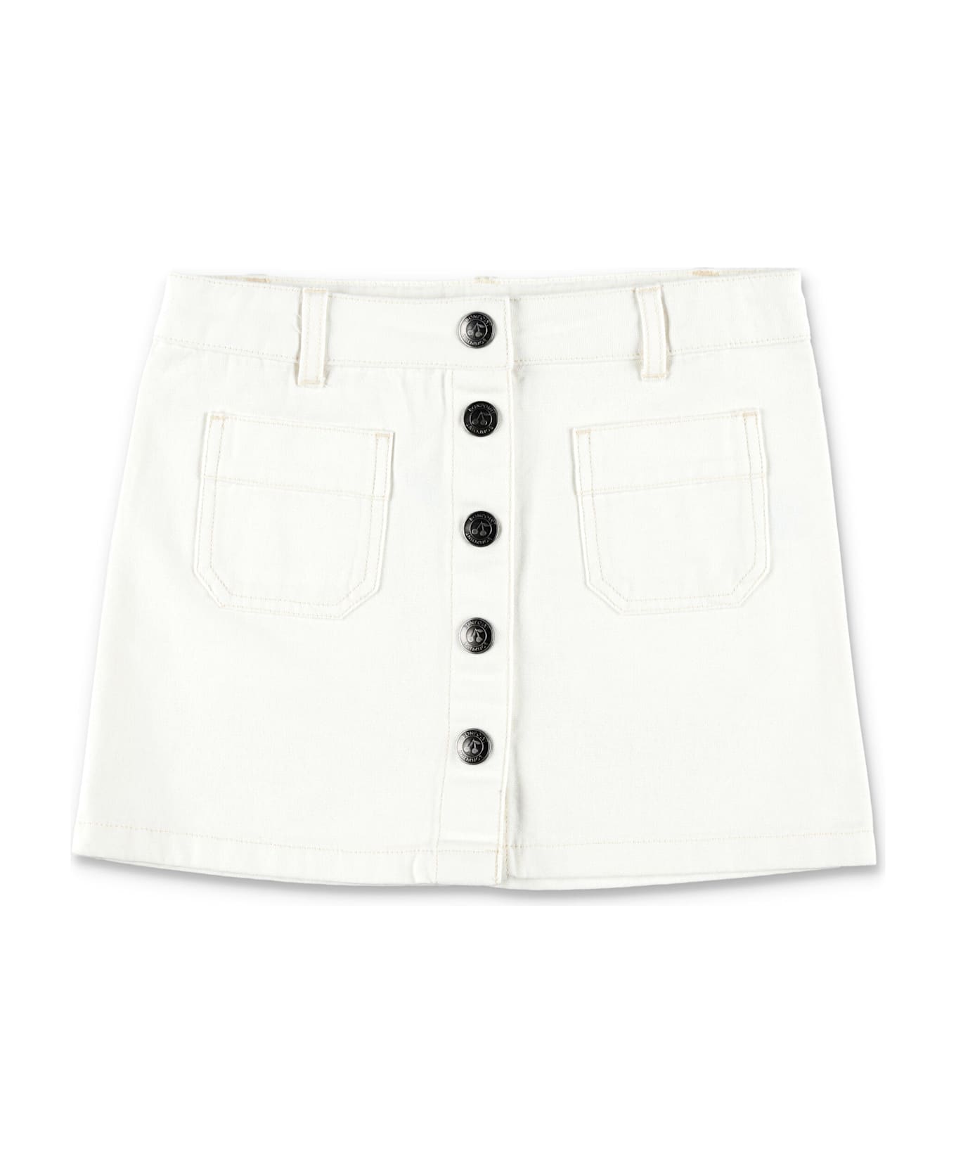 Cotton Elise Buttoned Mini Skirt By Bonpoint. Featuring: Adjustable Waistband Belt Loops Front Buttons Fastening Two Patch Pockets At Front And Back Cherry Embroidery On The Back Pocket