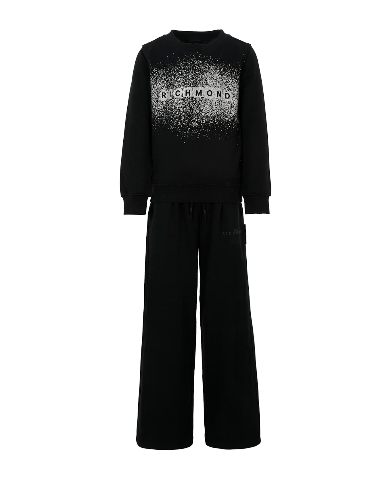 Black suit in brushed cotton blend, consisting of a sweatshirt and trousers. Long-sleeved sweatshirt, with a ribbed crew neck, cuffs and hem; it is embellished with a lurex logo on the front. Trousers with an elasticated waist, drawstring, side pockets and pockets on the back; they are embellished with a logo on one leg.