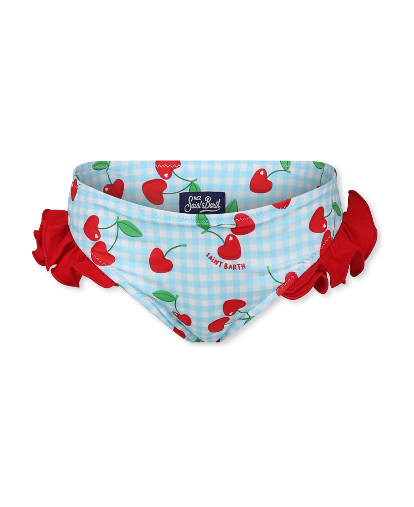 Light blue gingham swim briefs, with red ruffles on the sides. Embellished with all-over cherries and a logo patch on the back.