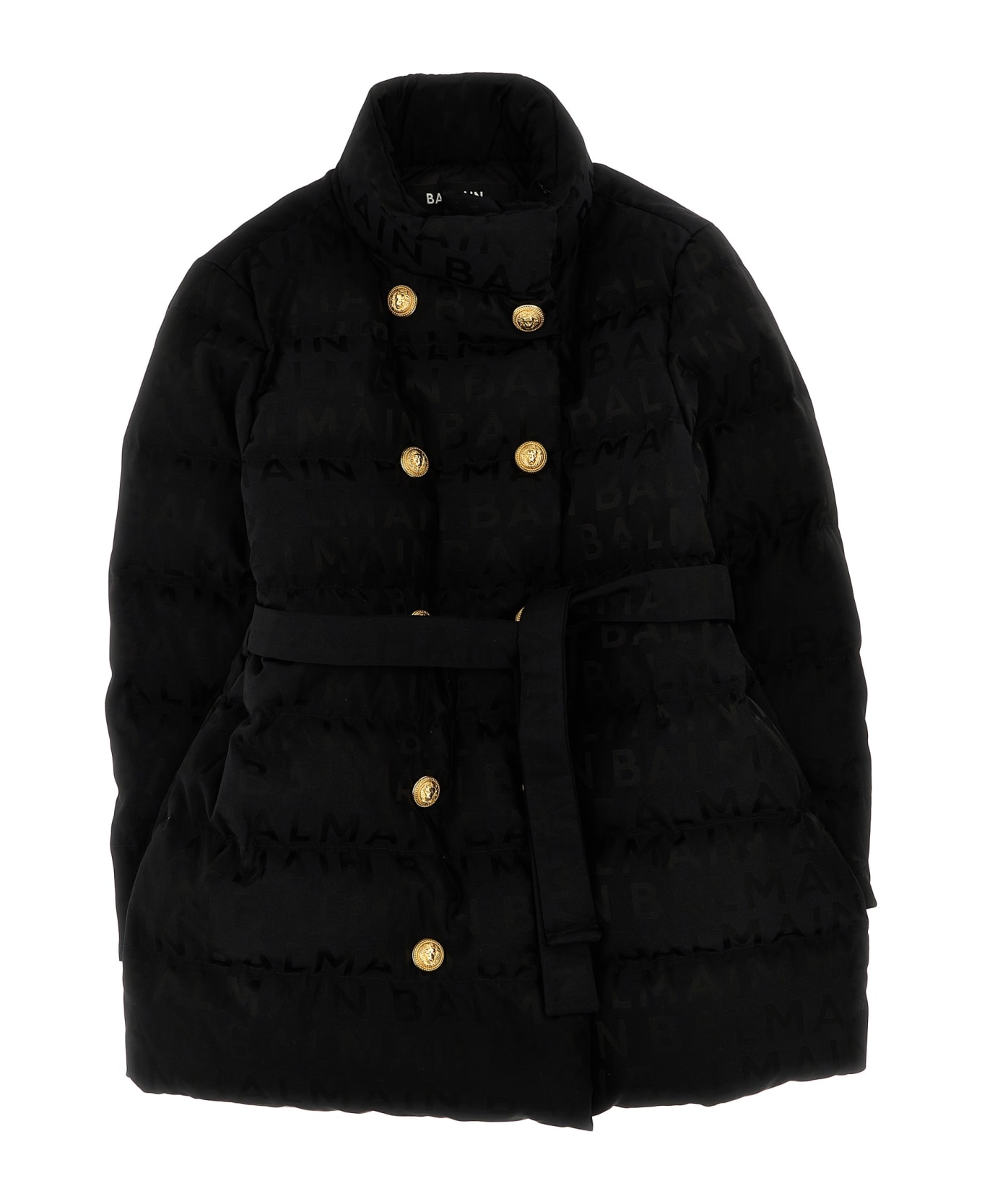 Nylon blend down jacket with all-over logo pattern, front gold button appliqué, double zip and button closure, pockets, long sleeves with elsatic cuffs. Composition: 66% polyamide 34% cotton