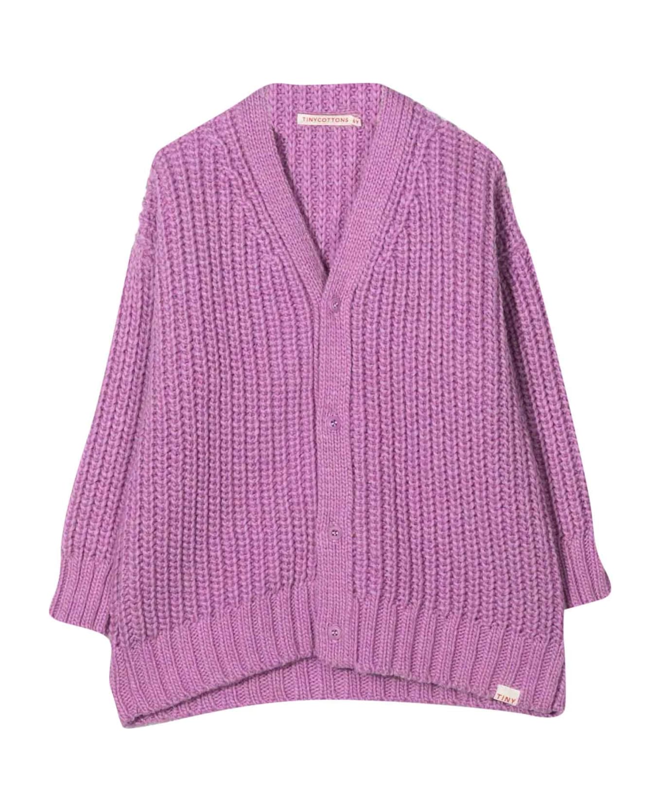 Purple cardigan unisex Tiny Cottons. Chunky ribbed sweater, mini logo plate, low shoulder sleeves, V neckline, front button closure, long sleeves and straight hem. Polyacrylic 40%, Alpaca 20%, Merino Wool 20%, Wool 20%