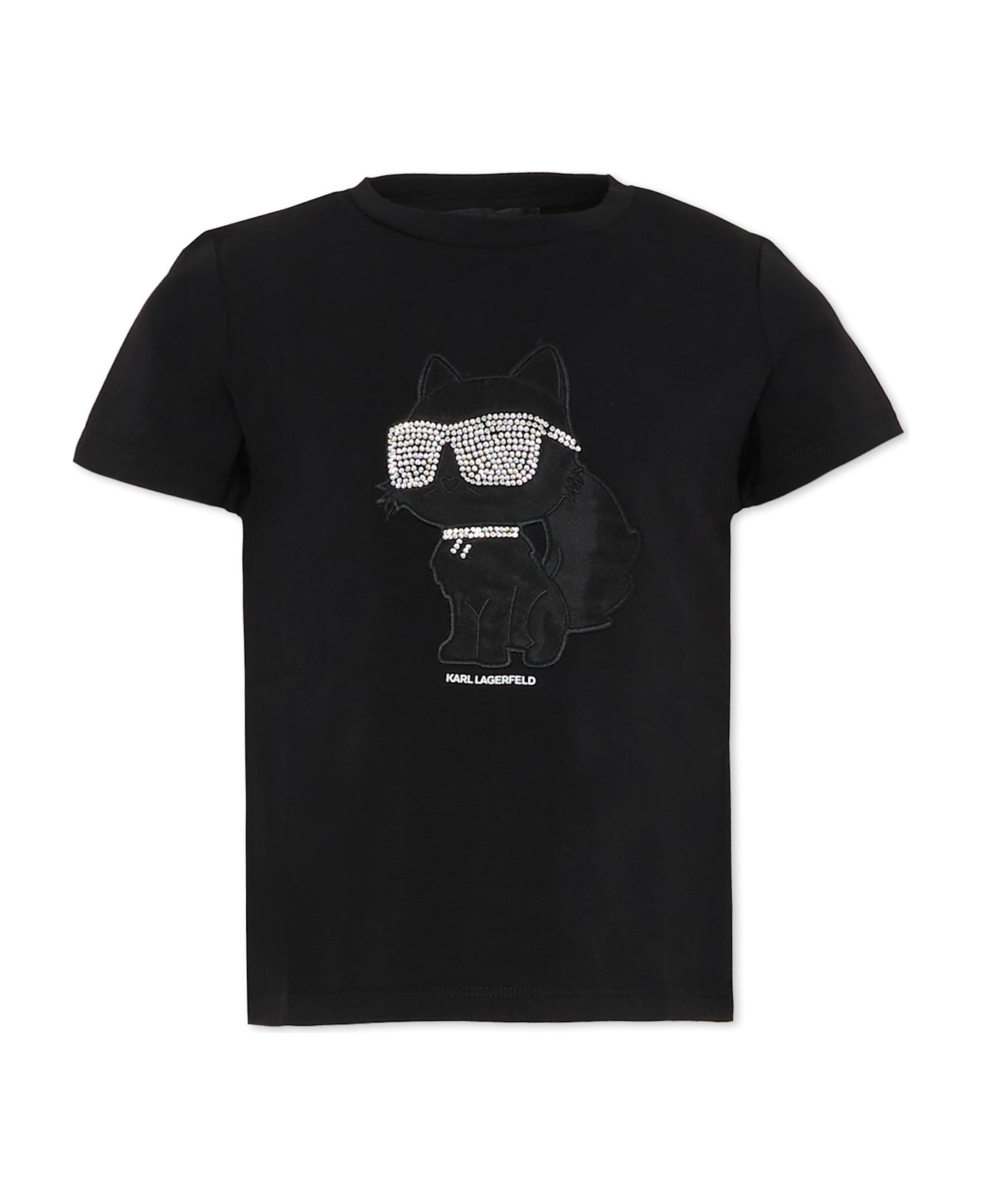 Black organic cotton blend t-shirt with short sleeves and ribbed crew neck. It is embellished with Choupette and rhinestones on the front and logo on the back.