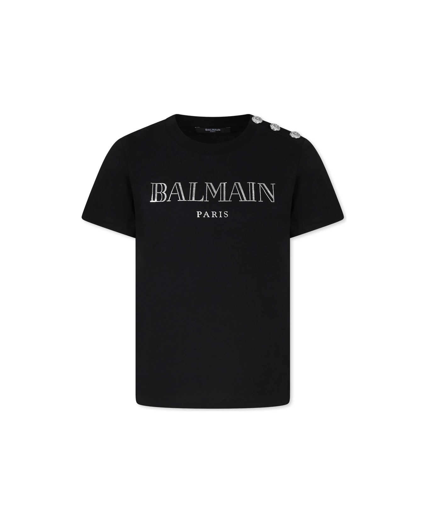 Black organic cotton t-shirt, short sleeves, ribbed crew neck and closure with iconic silver buttons on the shoulder. It is embellished with silver metallic effect Balmain logo on the front.