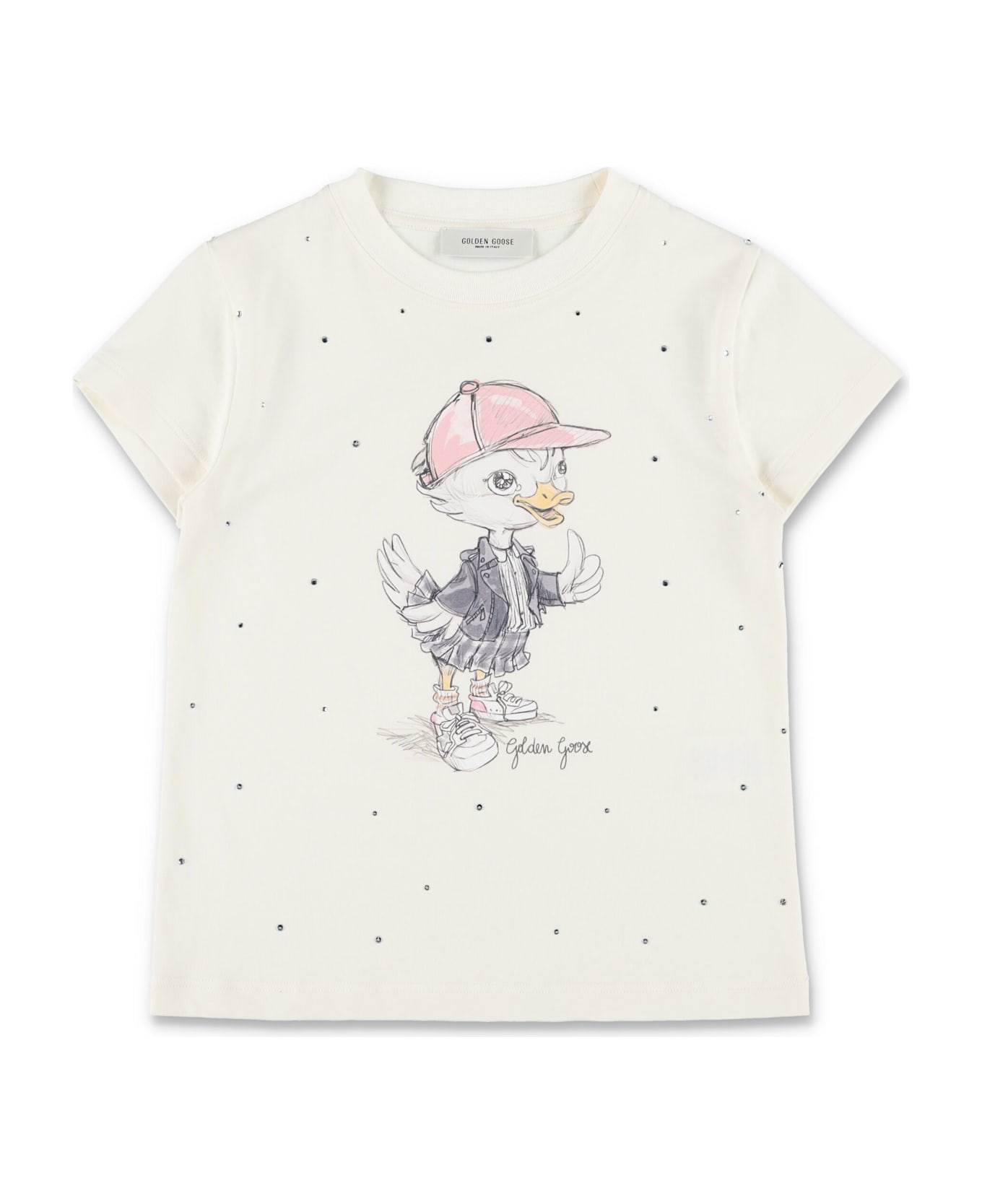 This Golden Goose Kids Journey T-shirt In White Cotton Jersey Brings Playful Shine To Everyday Looks. The Pink-toned Digital Golden Mascot Print Is Enriched With All-over Crystal Appliqués, While The Crew Neck, Short Sleeves And Regular Fit Ensure Effortless Comfort For Girls. Cotton Jersey Golden Mascot Digital Front Print Pink-shaded Graphic All-over Crystal Appliqués Crew Neck Short Sleeves Regular Fit