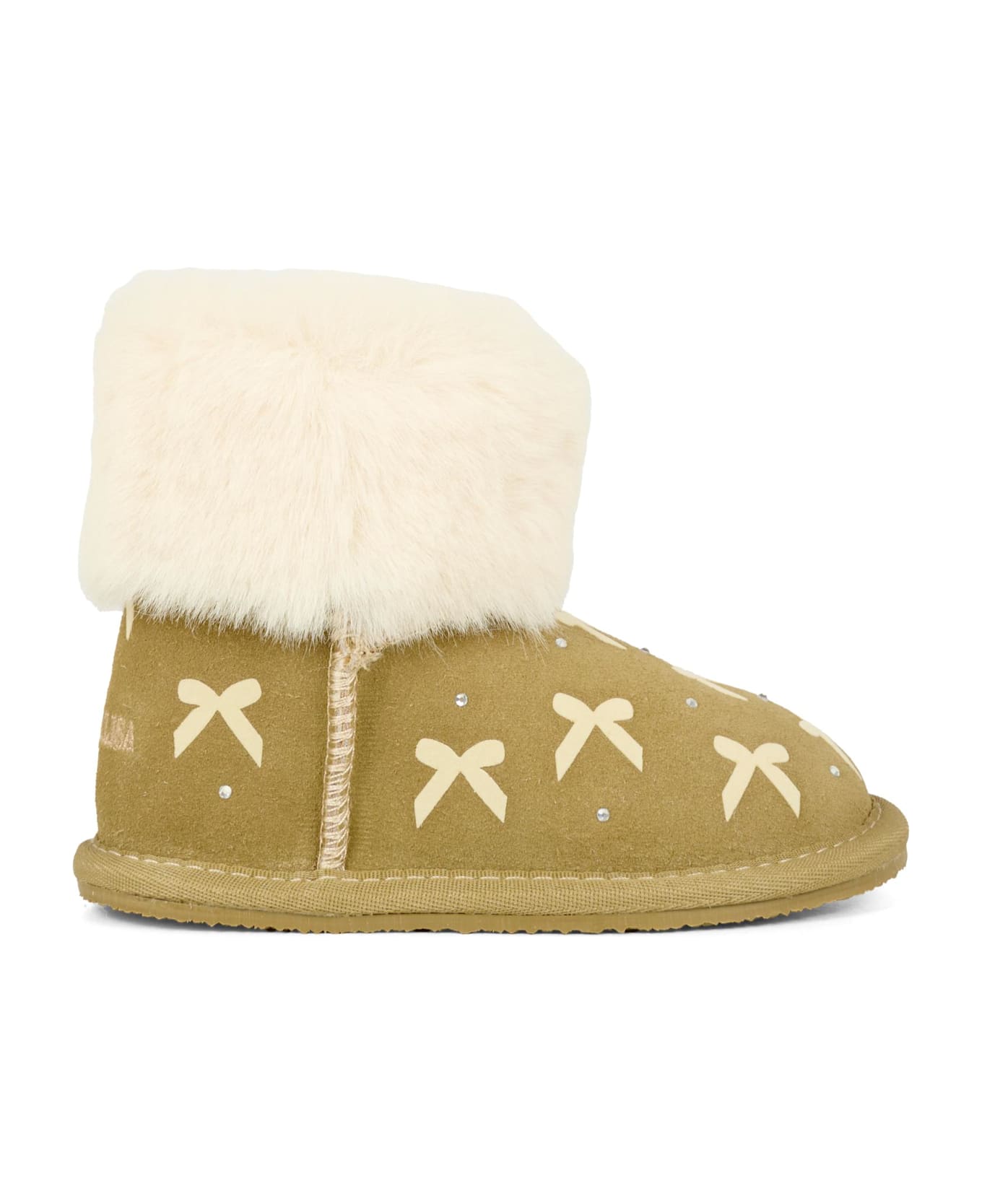 Beige suede ankle boots, with rubber soles, faux fur lining, and faux fur detail on the upper. They are embellished with rhinestones and an all-over bow and with an embroidered logo on the back.
