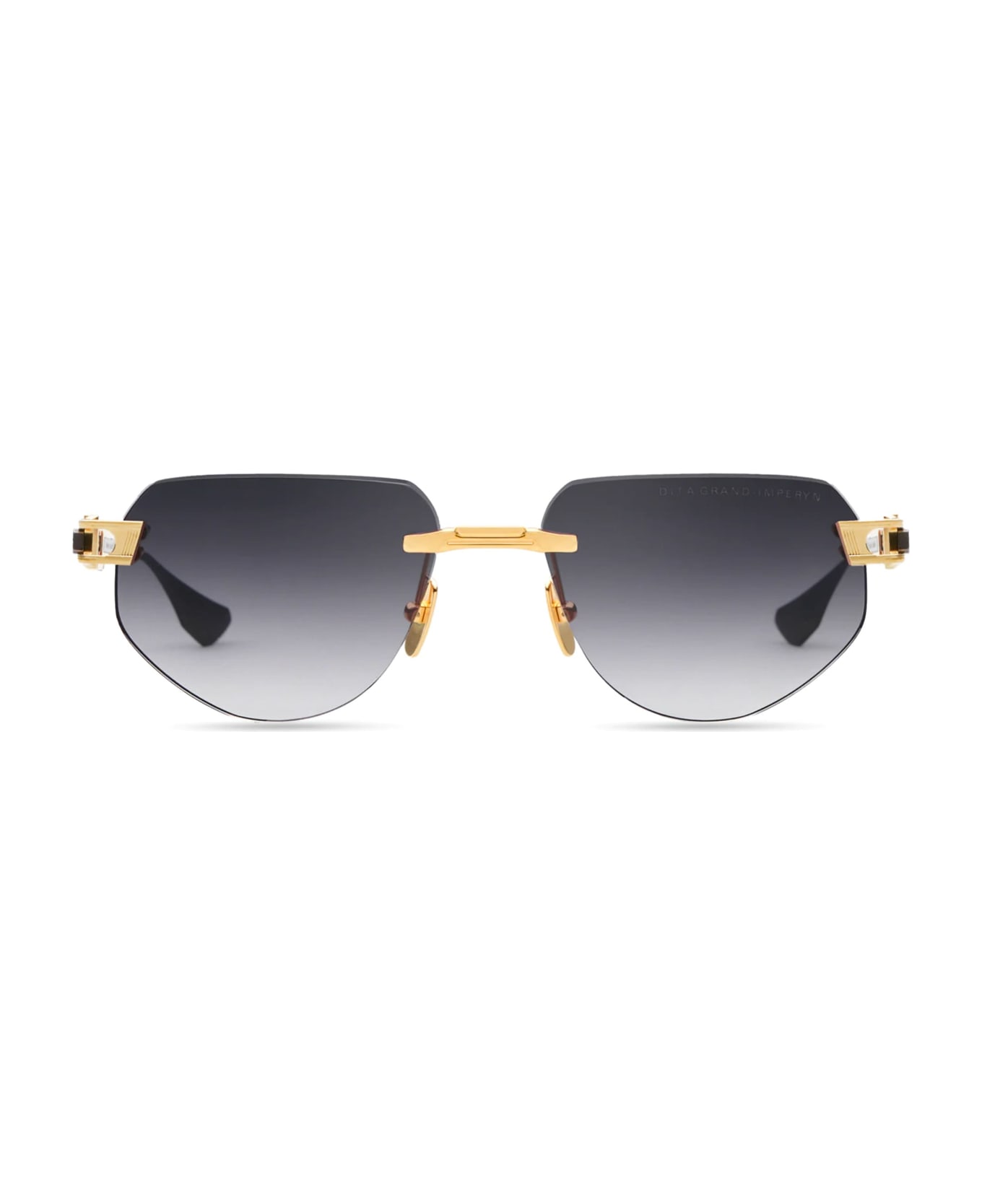 DITA GRAND-IMPERYN - YELLOW GOLD / BLACK IRON (DTS164-A-01) are oval sunglasses made in Japan. They feature rimless yellow gold titanium frame construction, titanium 2-piece nose bridge, screw mounted lenses, custom Dita's unique 3-piece titanium hinge with enamel inlay, and gradient grey lens with 100% UV protection.
