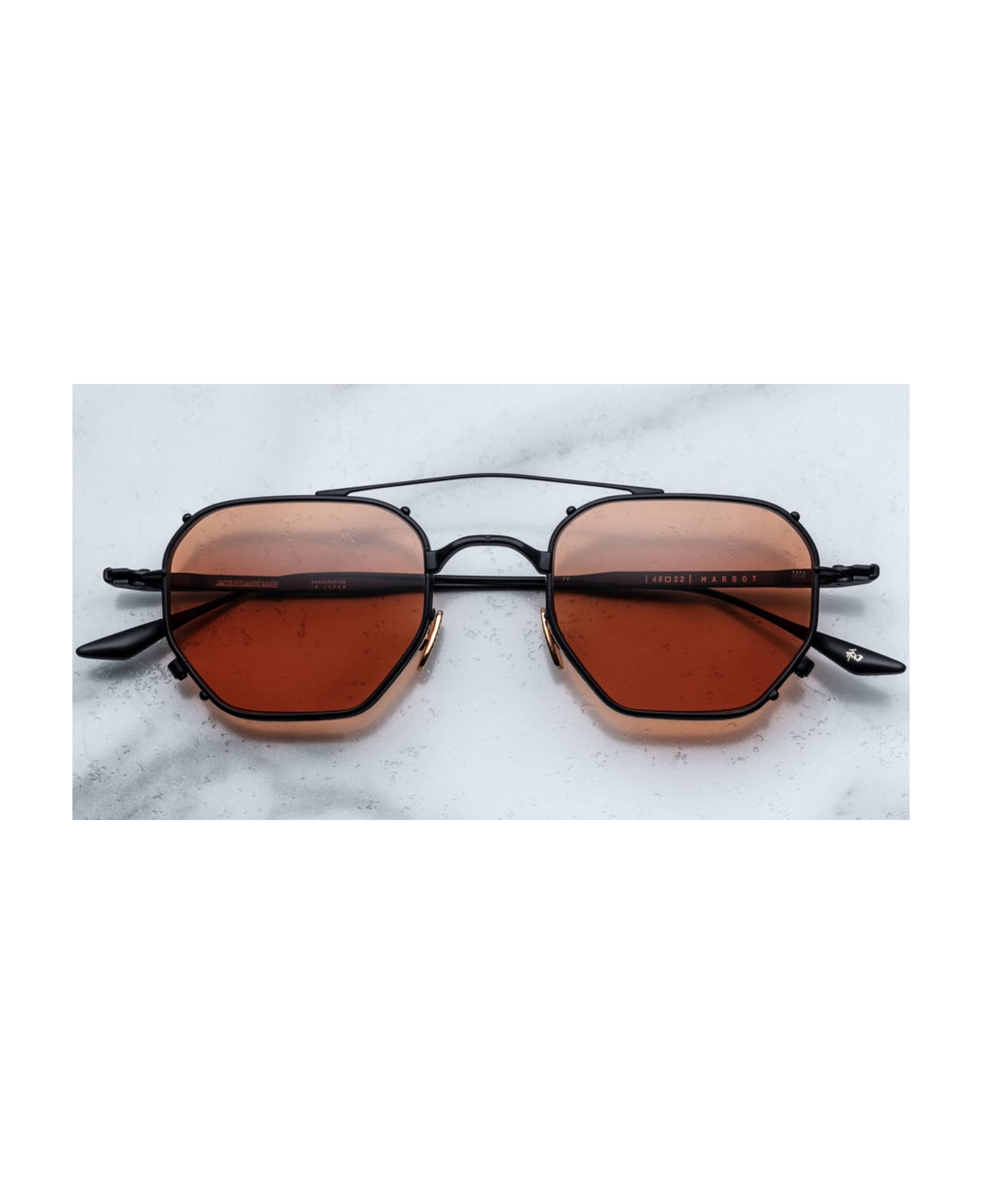 Jacques Marie Mage MARBOT - BLACK (JMMMA-88) are octagonal sunglasses made in Japan, part of the Titanium Series. They feature well-balanced, unisex octagonal lens shape and double-wire rim, black beta titanium structure, 100% beta titanium frame with a bold architectural double-hinge, steel and beta titanium temples with custom detail temple tip, monoblock beta titanium hinge, custom 4mm rim wire with hairline detail, custom nose pads with logo and hairline engraving, 4 base CR39 lens with backside anti-reflective treatment and 100% UV protection.