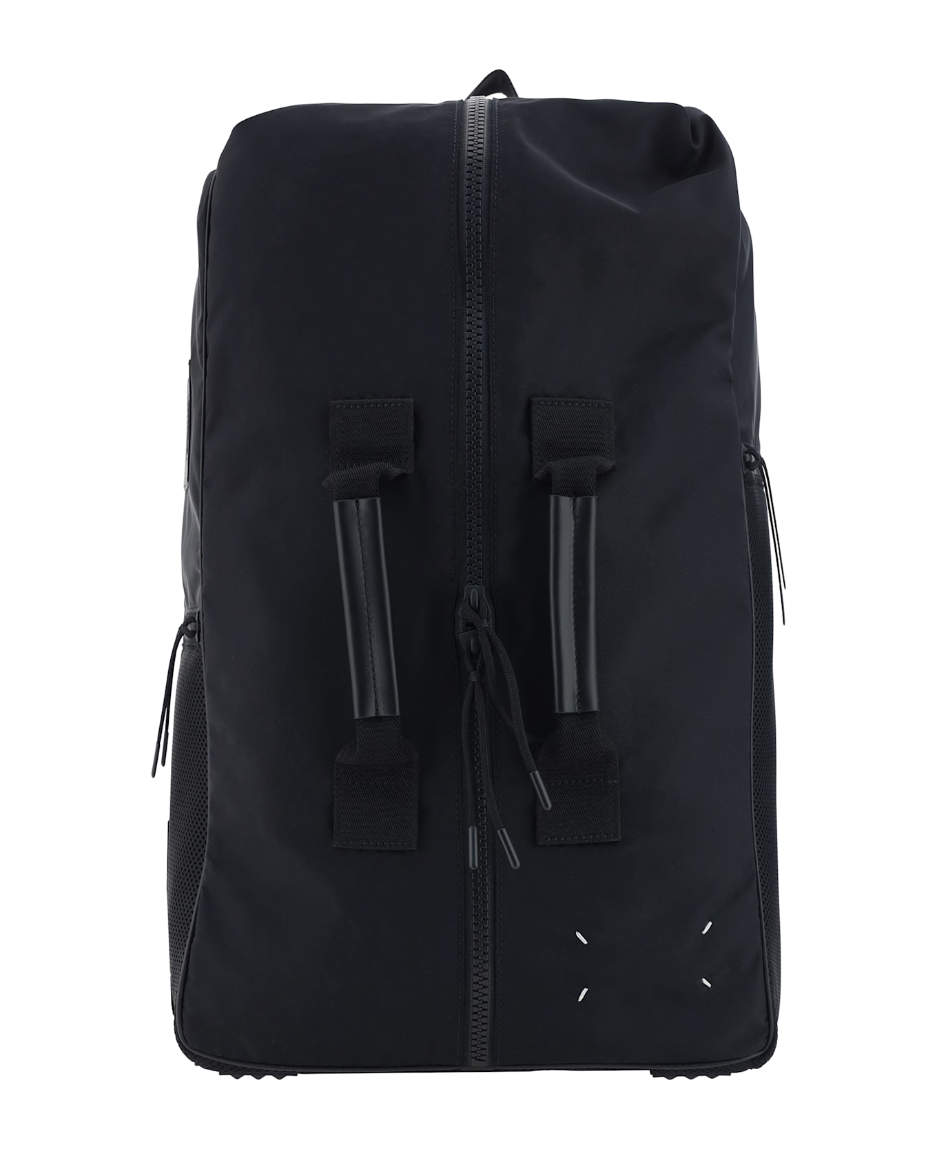 Weekender travel backpack by margiela, front closure by double-slider zipper, two adjustable shoulder straps at the back, two short handles at the front, one handle at the top, iconic contrasting brand stitching at the front, two side zipper pockets.
