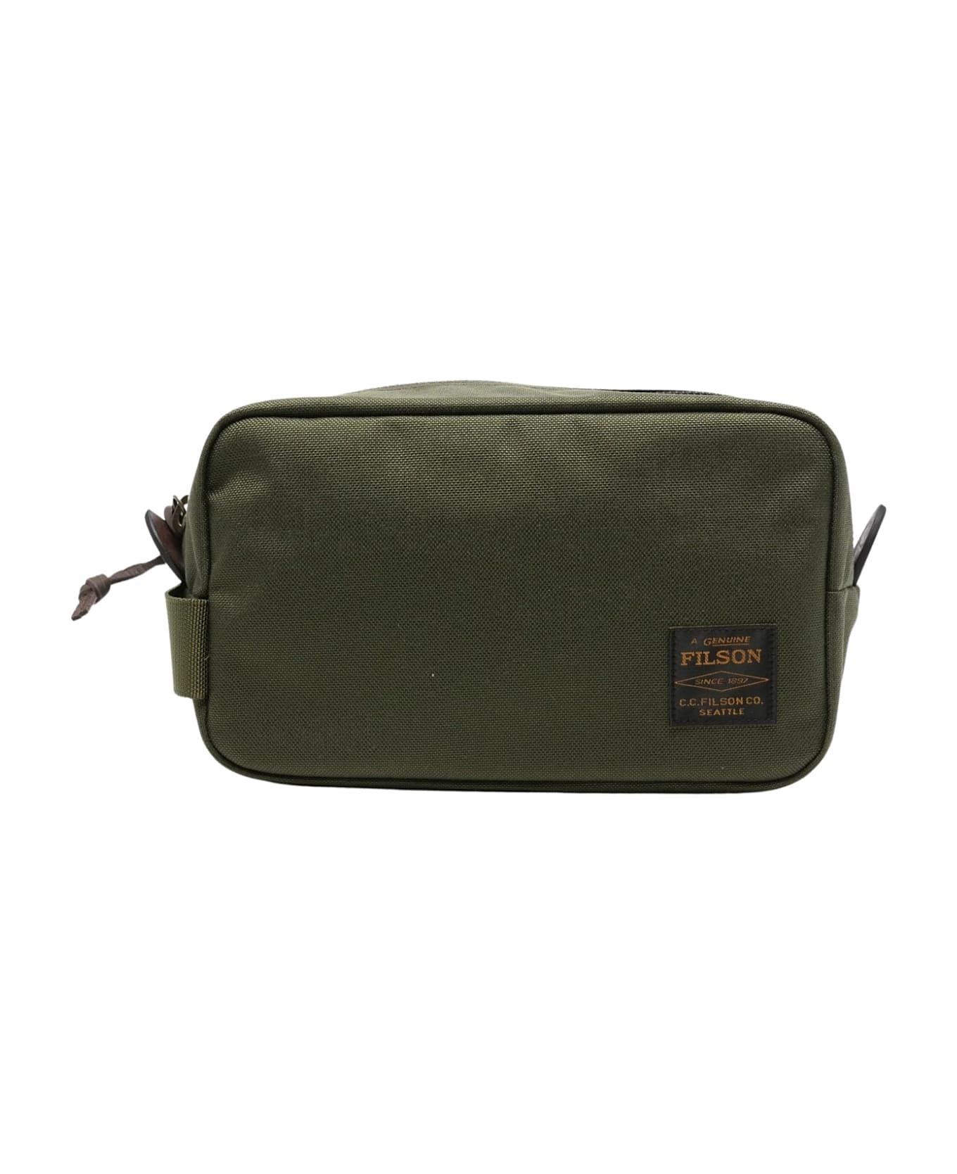 olive green zip fastening top handle logo patch rectangular shape