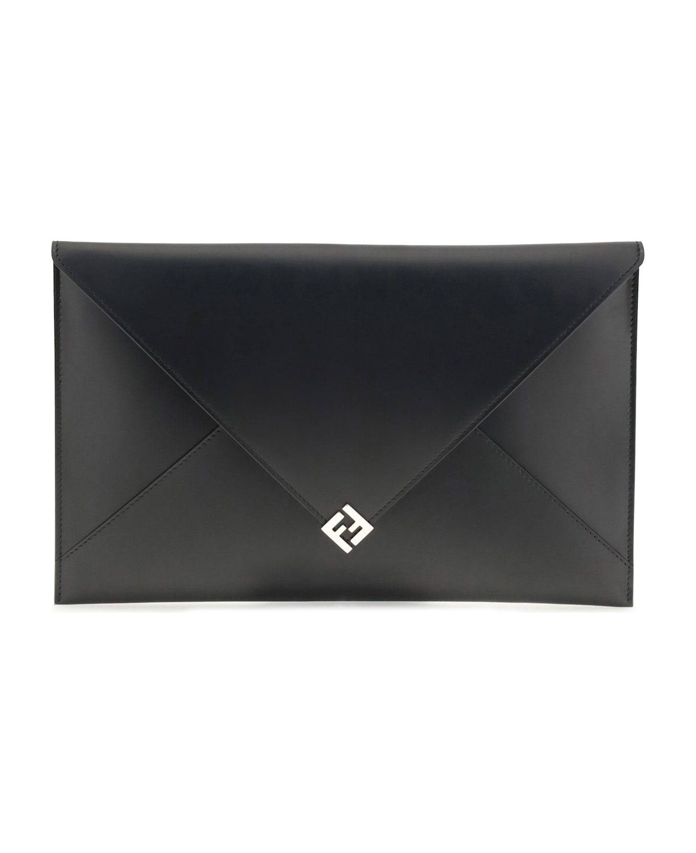 Fendi's large squared ff pouch is a stylish and functional pouch featuring a large format and a practical cuff handle for easy carrying. made of high-quality black leather, it features a snap-button closure to ensure security and practicality. the interior, coordinated in the same hue, features eight card slots, perfect for neatly organizing all your essentials. metallic accessories with a palladium finish complete the design, adding a touch of sophistication and modernity.