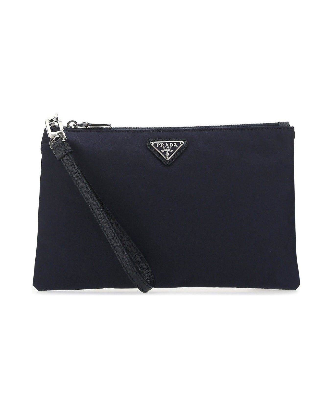 Clutch realized in Re-nylon enriched by iconic logoed triangle at the front. - Detachable tonal leather wrist handle - Zip closure - Lined interior Composition: Exterior: 100% Re-nylon Lining: 100% Re-nylon Finishing: Silver metal
