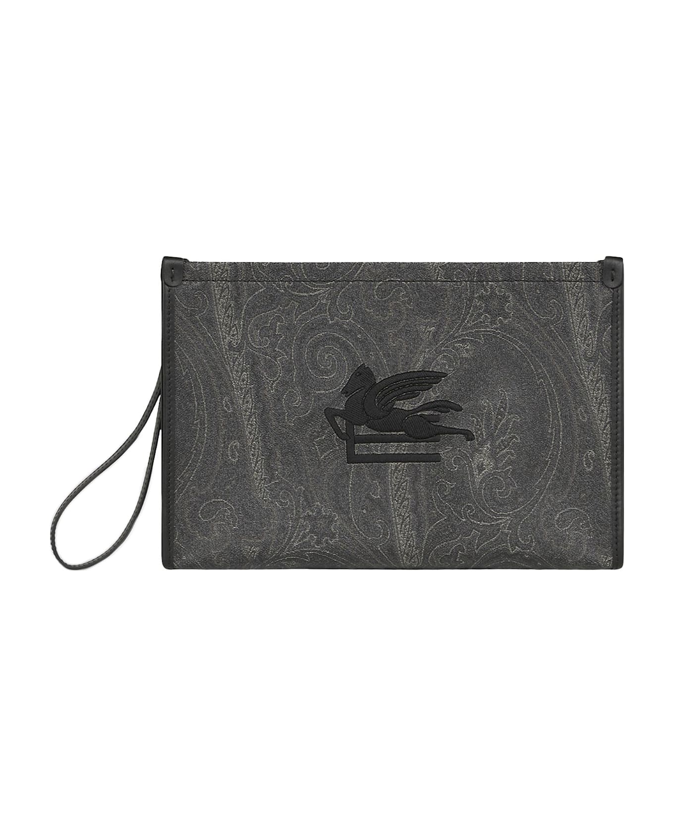 Composition: Top Zip Closure Detachable Leather Wrist Strap Tone-on-tone Etro And Pegaso Logo Embroidered At Front Interior: One Main Compartment, One Patch Pocket, Internal Logo Label; Striped Fabric Lining Calf Leather Details Black Color Exterior: Paisley Jacquard Cotton Fabric Coated With Matt Texture And Lined With Canvas - Coating:, 100% Pvc; Details:, 100% Calf Leather; Interior:, 100% Polyester Made In Italy