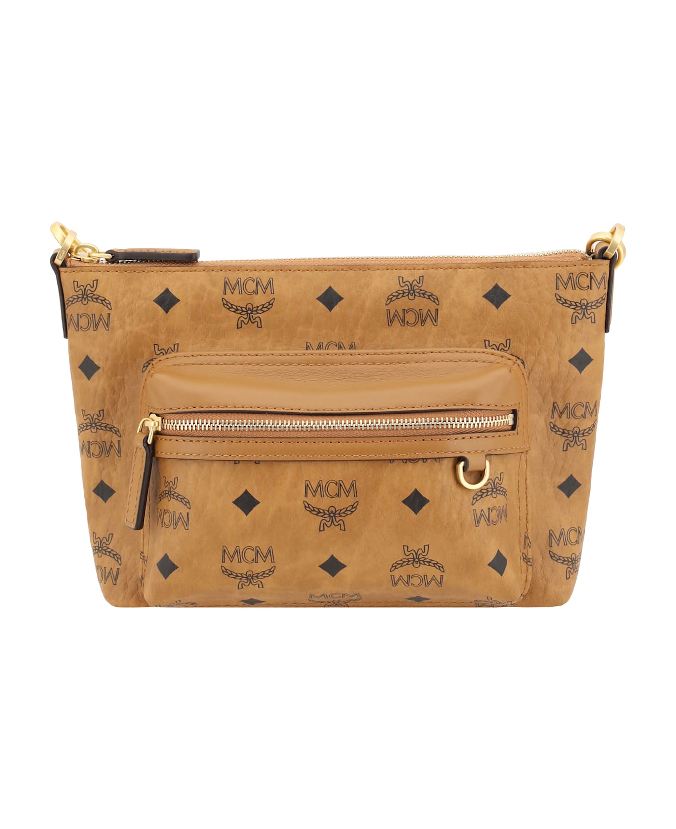 Leather aren visetos shoulder bag by mcm, adjustable and removable shoulder strap, zipper closure at top, zippered patch pocket at front, iconic all-over contrasting brand logo, single interior compartment.