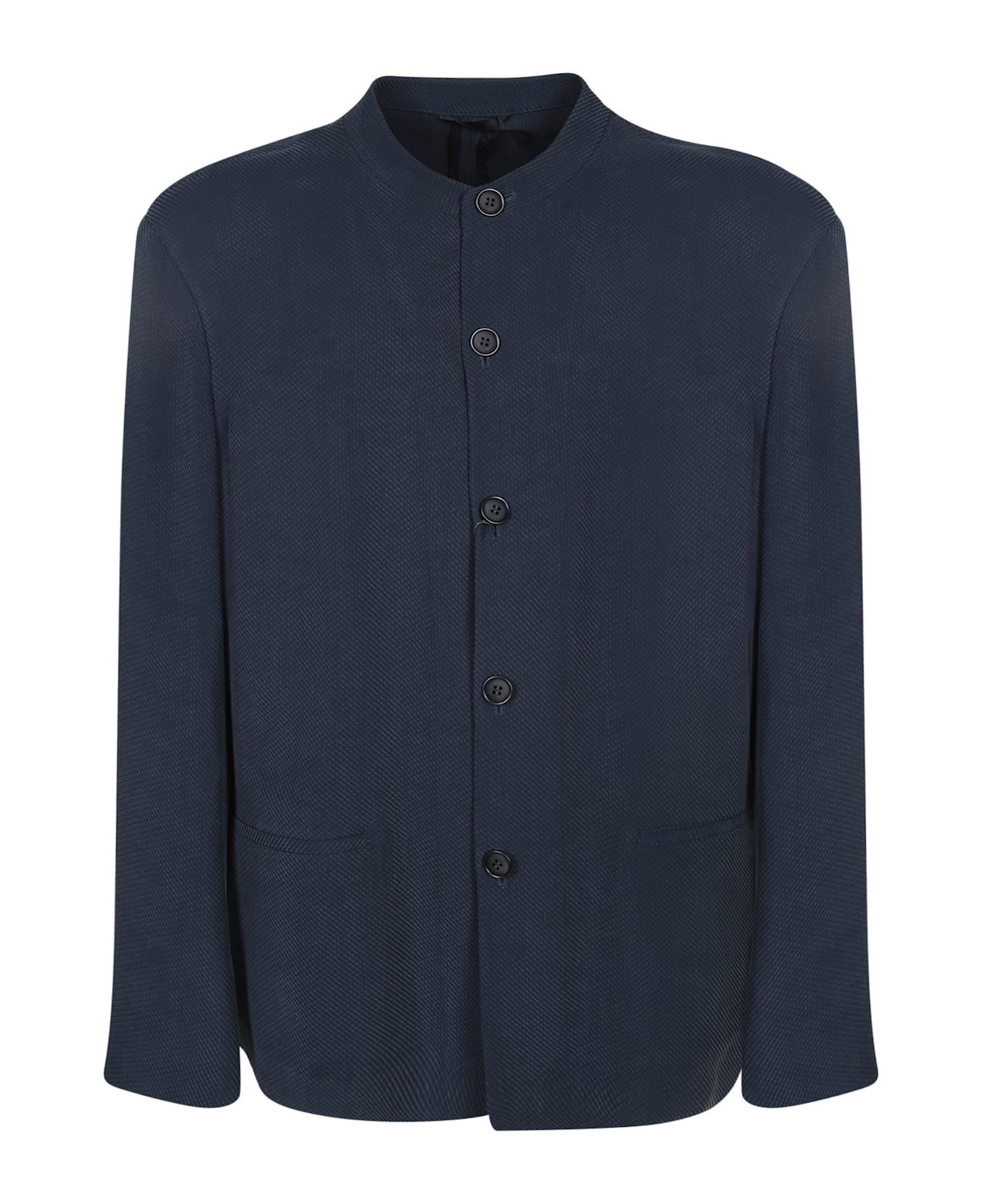 Explore understated elegance with this blue cupro Giorgio Armani jacket. Its modern collarless cut and minimalist detailing echo a sophisticated, versatile style.