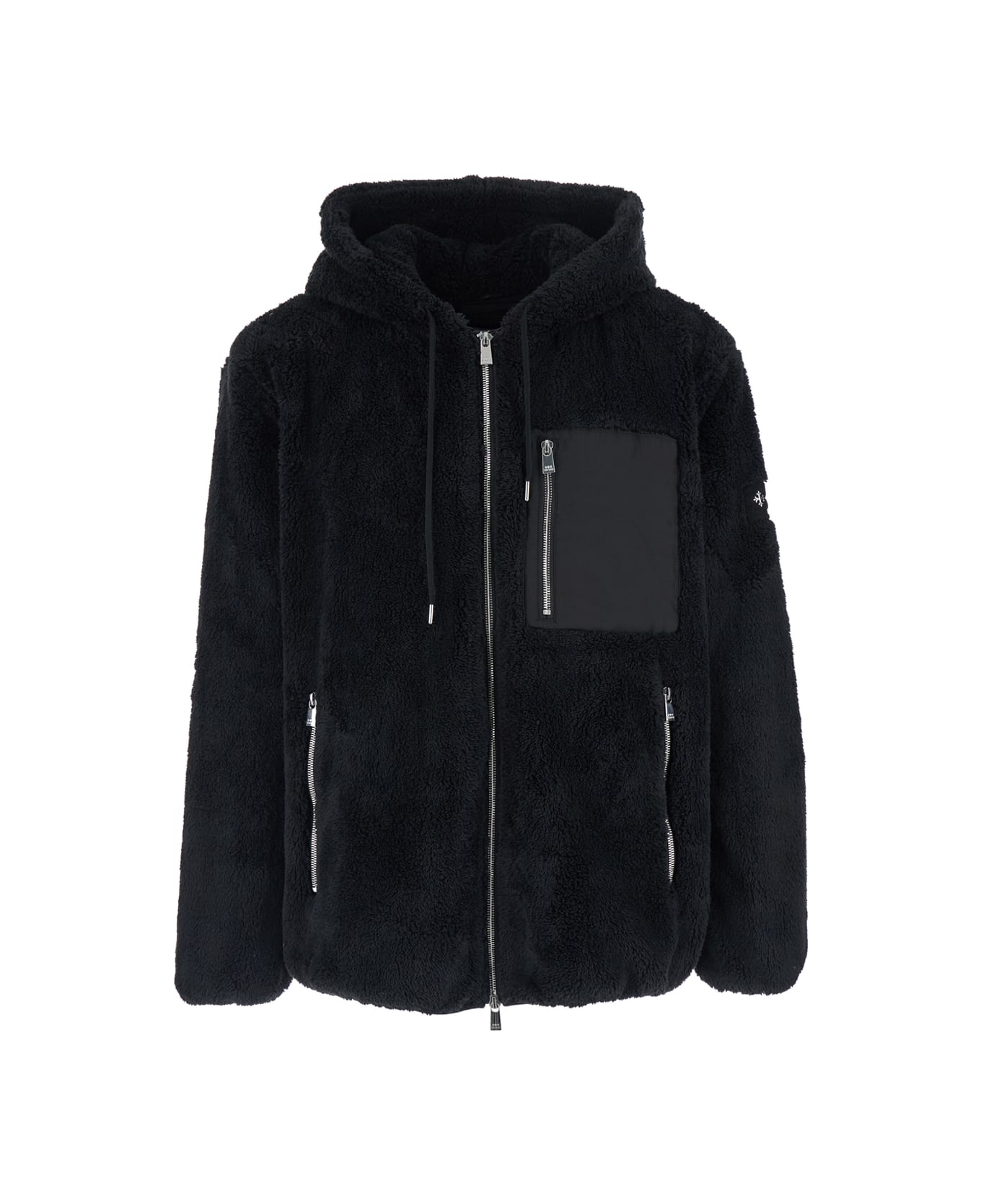 'menfi' Black Jacket With Drawstring Hood And Logo Patch On The Sleeve In Ecofur Man