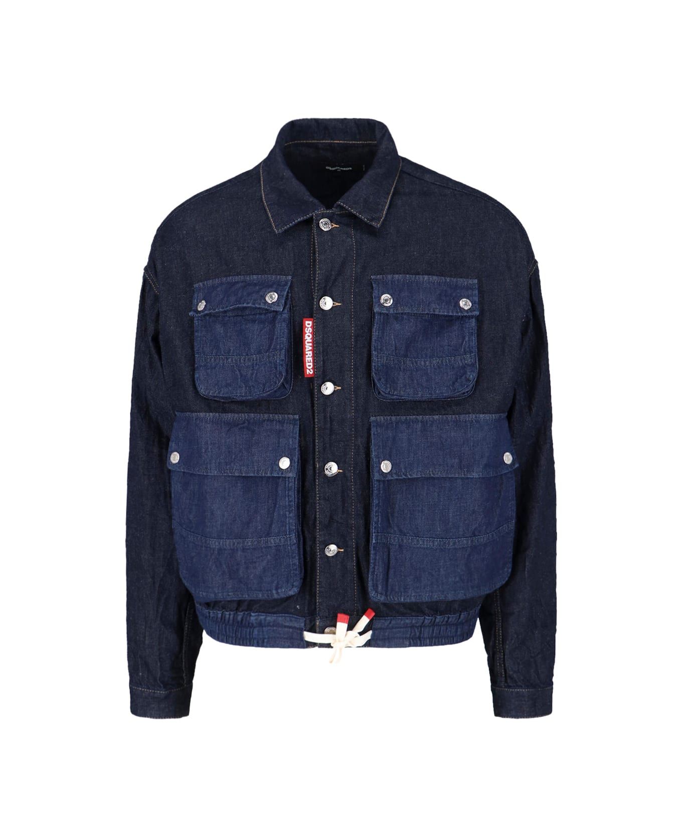 Dsquared2 blue cotton and hemp denim cargo jacket with collar, button closure, long sleeves, four front cargo pockets, multicolour logo tag. Composition: 87% Cotton, 13% Hemp