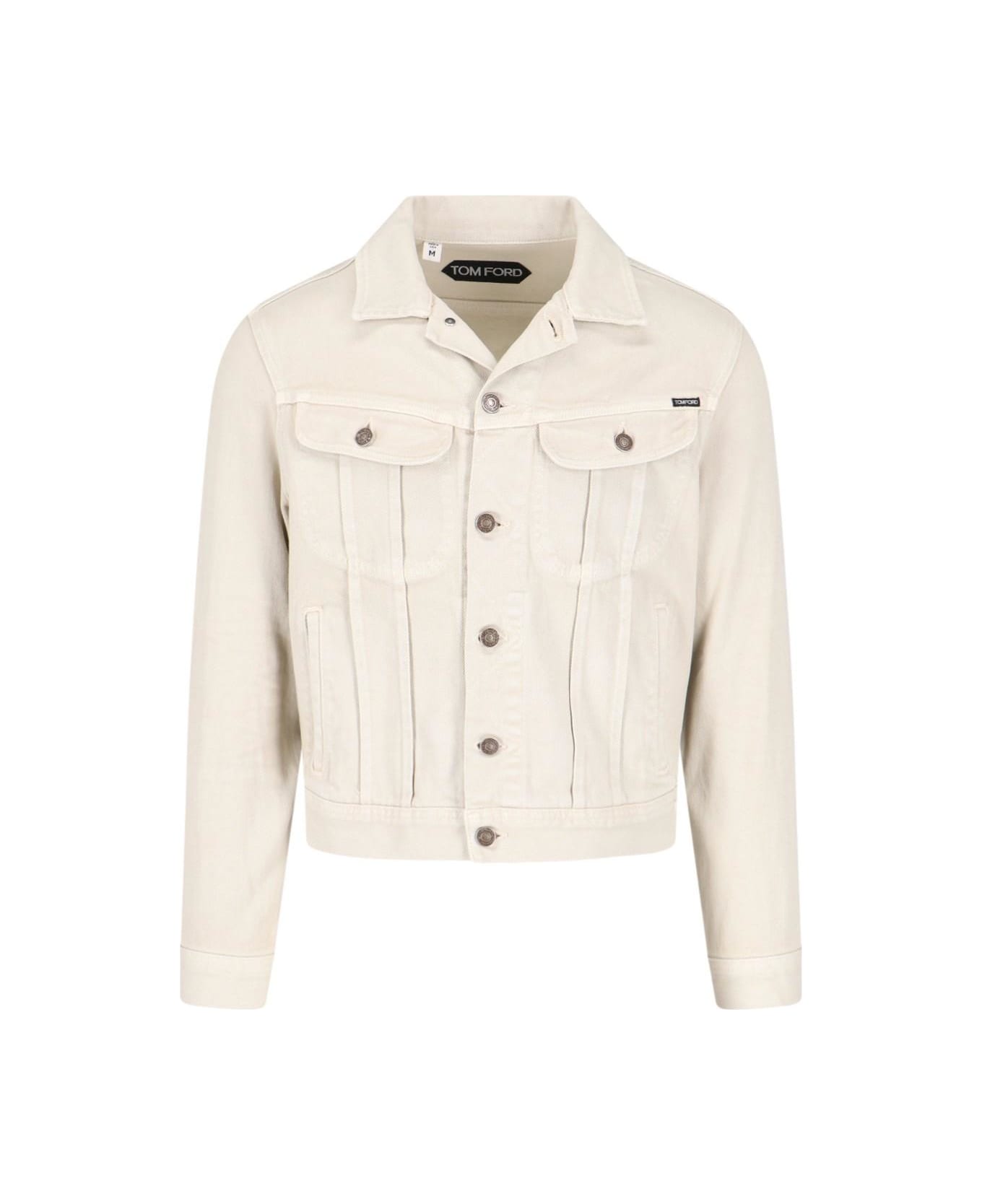 Tom Ford cream cotton blend denim jacket with classic collar, button closure, cuff buttons, two chest patch pockets, straight hem.