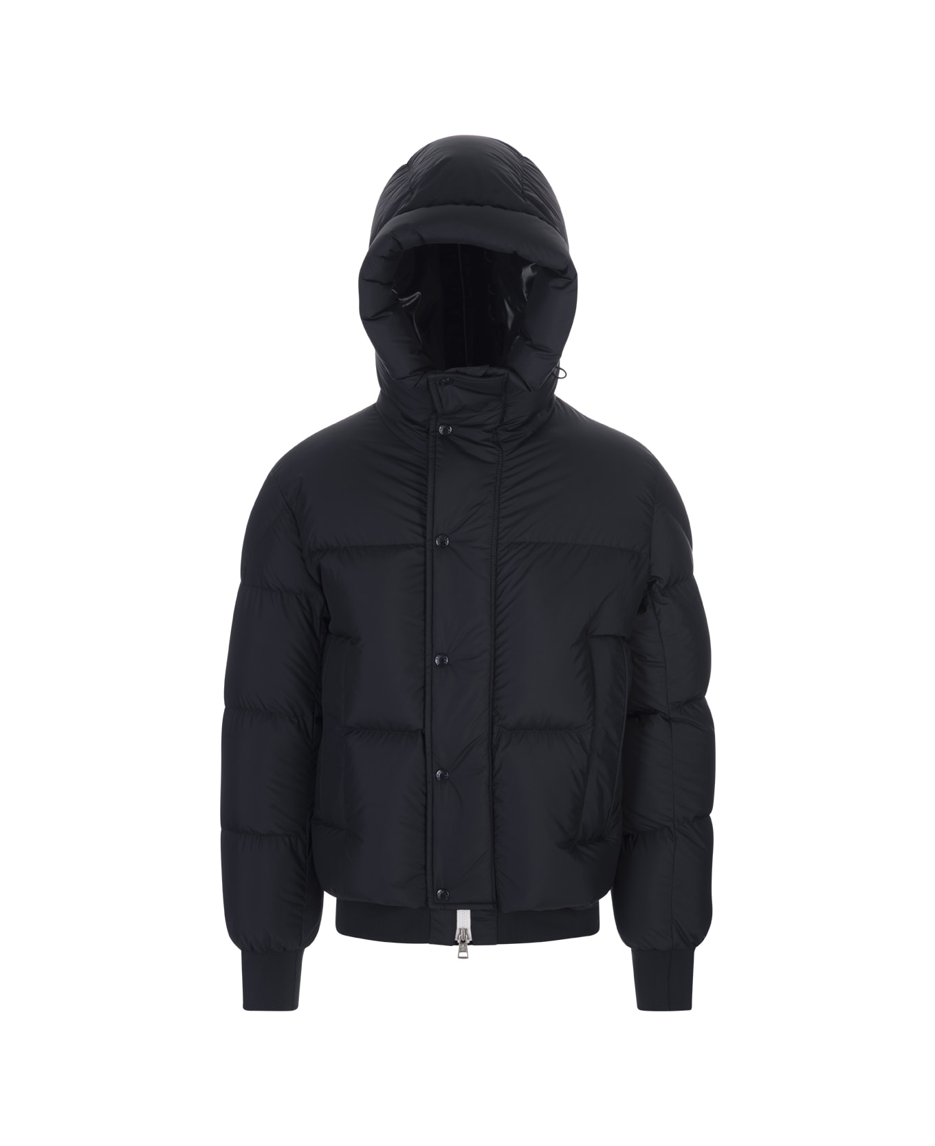 Navy blue Risler down jacket for men by Moncler in recycled matt polyester with down filling, recycled polyester lining and zip and snap fastening. Loose fit model featuring an adjustable hood, zip pockets, front flap for maximum protection, and ribbed cuffs and hem. Loose fit.