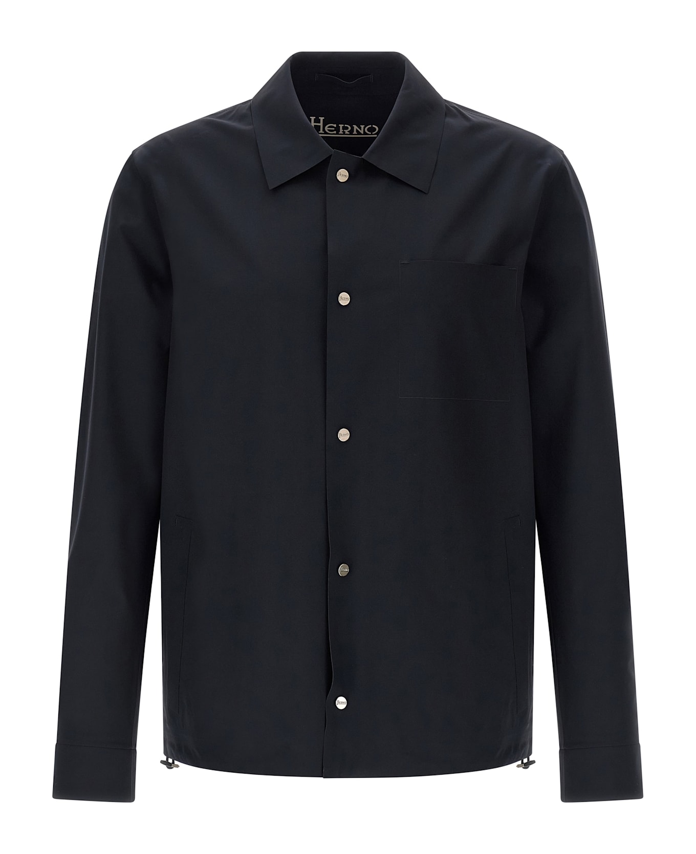'Essence' overshirt in water-repellent tape fabric, unlined, shirt collar, front snap button closure, pockets, long cuffed sleeves, drawstring on the hem. Composition: 84% polyamide, 16% elastane