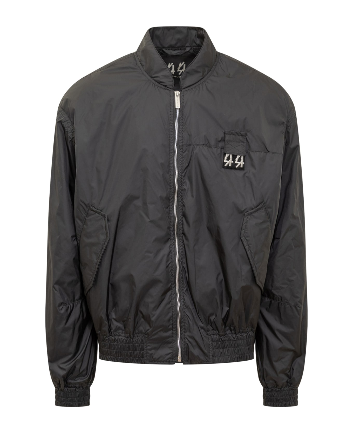Bomber jacket. High neck. Zip closure. Cuffs and elastic hem. Flap pockets on the front. Logo print on the back.