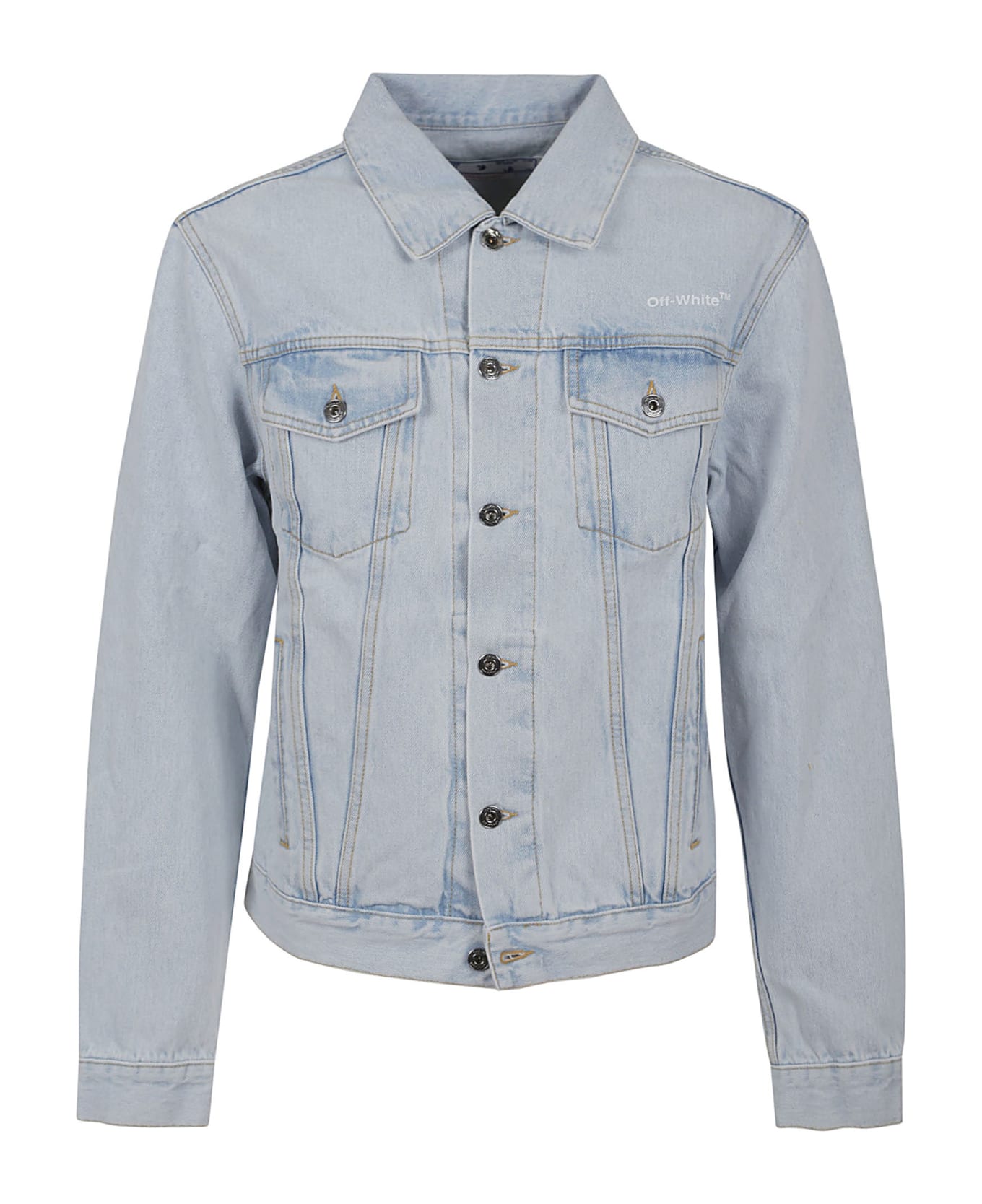 BY OFF WHITE denim jacket. Long sleeve; front closure with buttons; two flap pockets on the front and side open pockets. Black Arrow motif detail with snake effect details on the back.