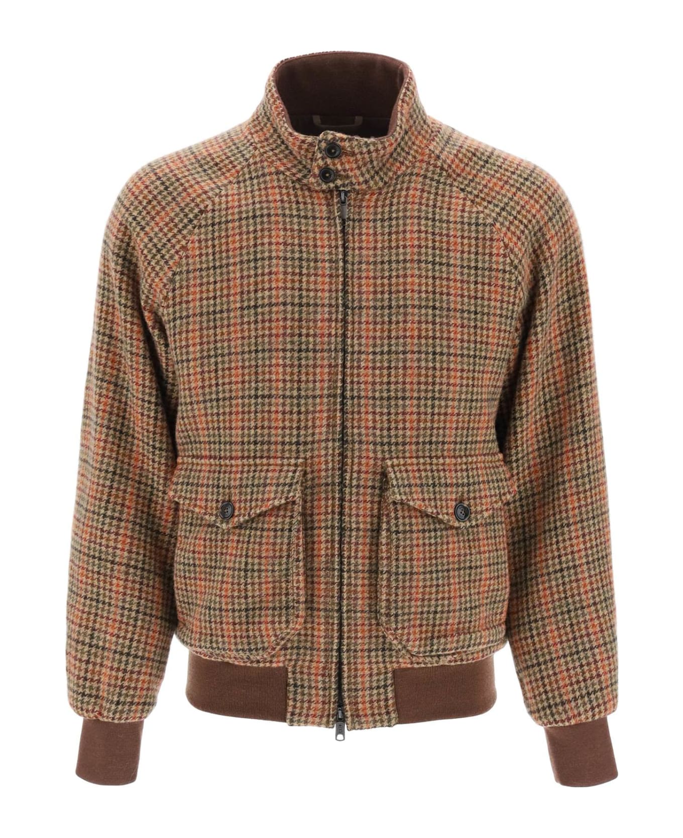 Bomber jacket by Baracuta crafted in pure virgin wool Houndstooth. It features stand collar with press studs, two-way zipper closure, raglan sleeves, gusset pockets with flap and buttons, hem and cuffs in ribbed knit and hallmark umbrella storm shield on the back. Lined and equipped with pockets on the inside. Regular fit. The model is 187 cm tall and wears size UK 40.