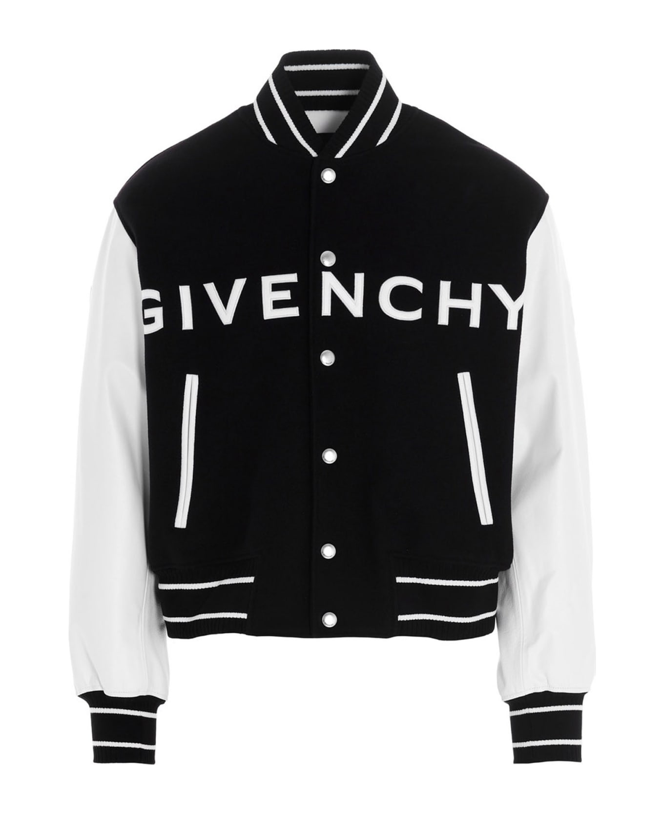 Givenchy wool and leather bomber jacket featuring a snap logo button fastening and embellished with contrasting leather logo details.