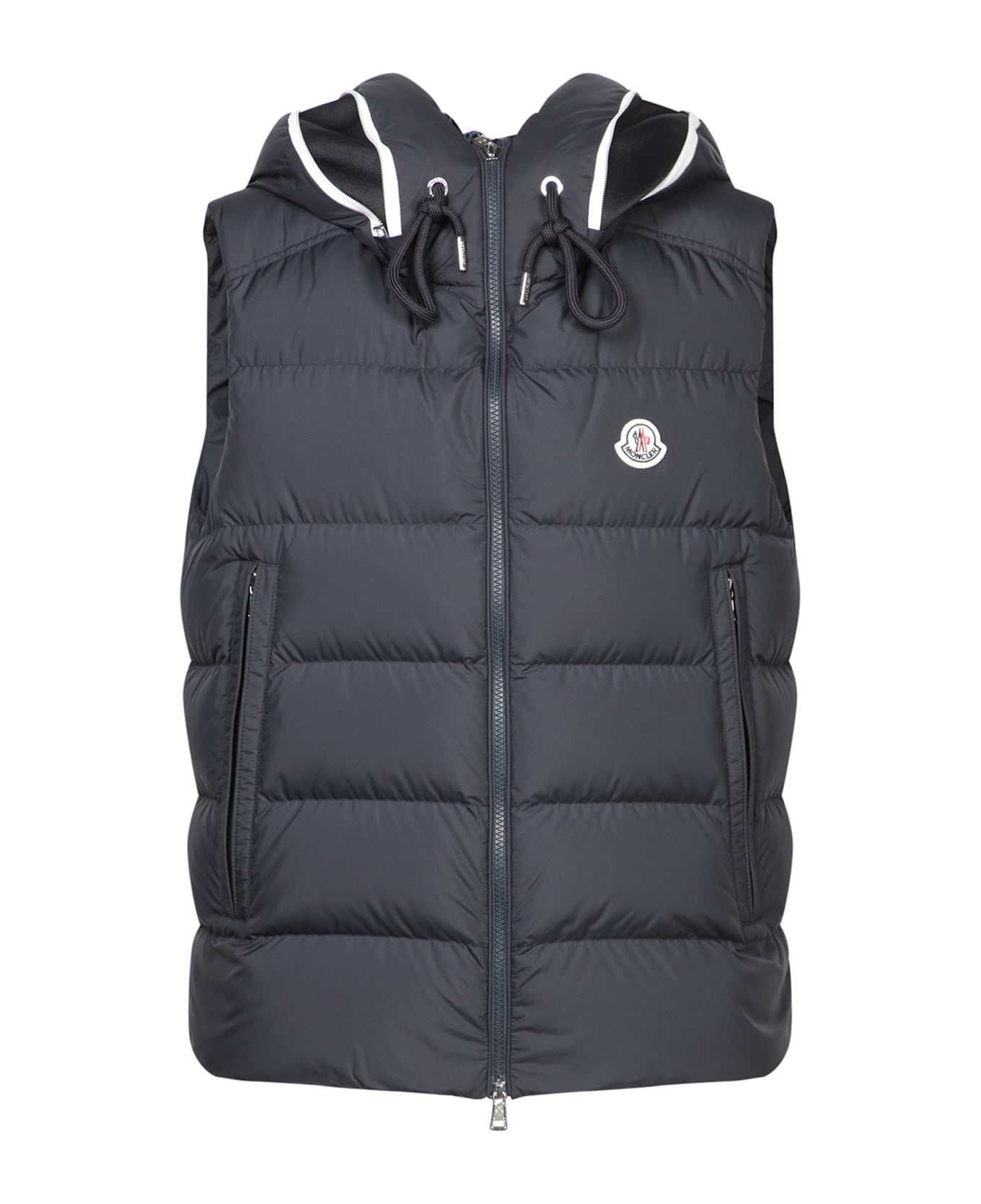 This blue Moncler down vest is perfect for cool mid-season days. Featuring a contemporary design with an adjustable hood and white trim details, it offers a modern and functional silhouette.