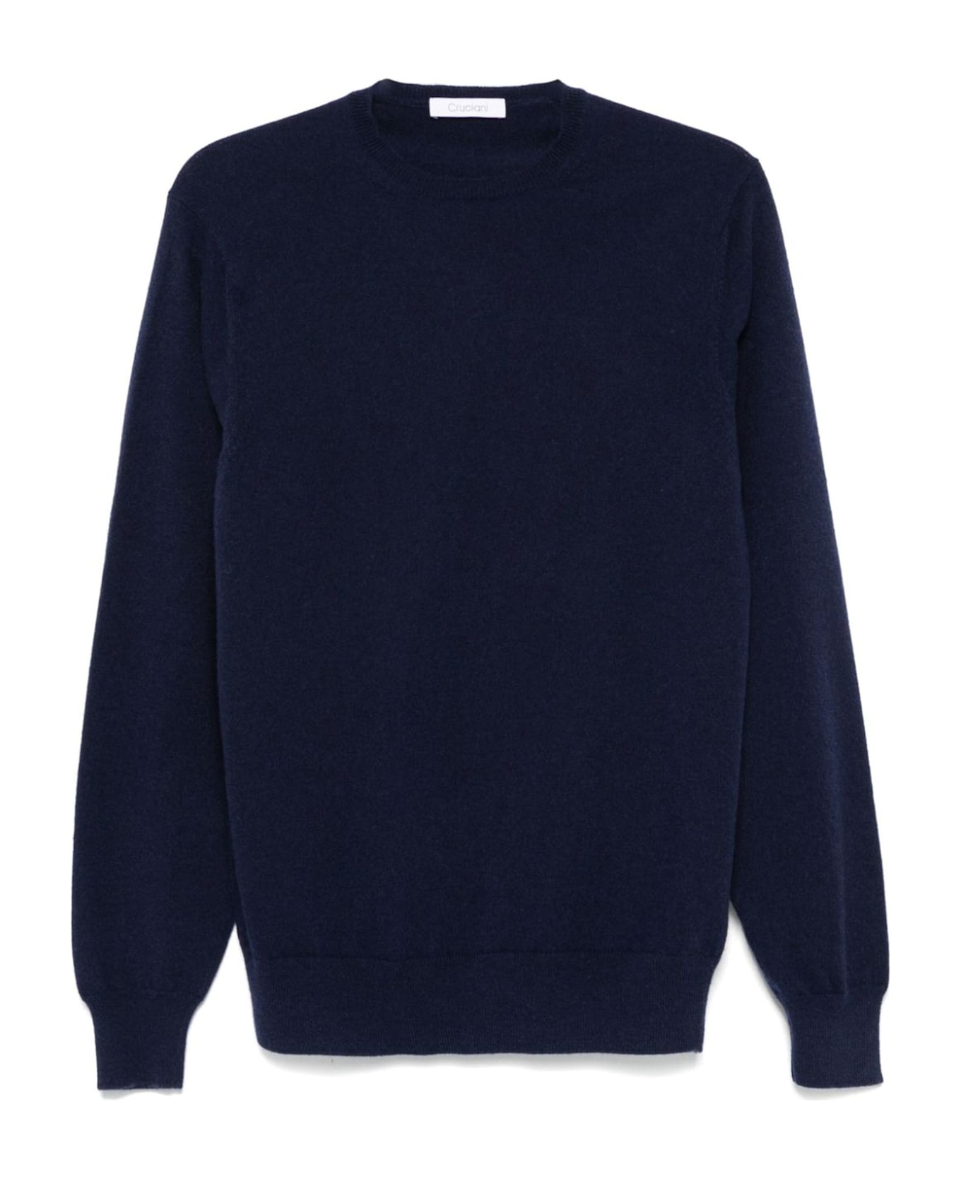 Blue cashmere sweater, fine knit, brushed effect, ribbed crew neck, long sleeves, ribbed cuffs and hem Composition: Cashmere, 100%