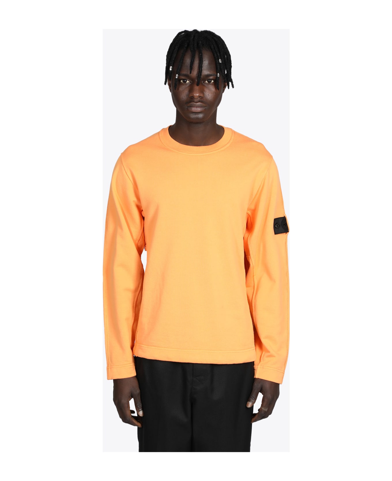 Orange cotton sweatshirt with ribbed crewneck, half hidden Stone Island Shadow Project badge on left sleeve, cotton mesh rectangular cooling panel side detail, drawstring at bottom hem, relaxed fit. The model is 185 cm and wears size M. Composition: 65% cotton 35% lyocell. Made in Italy.