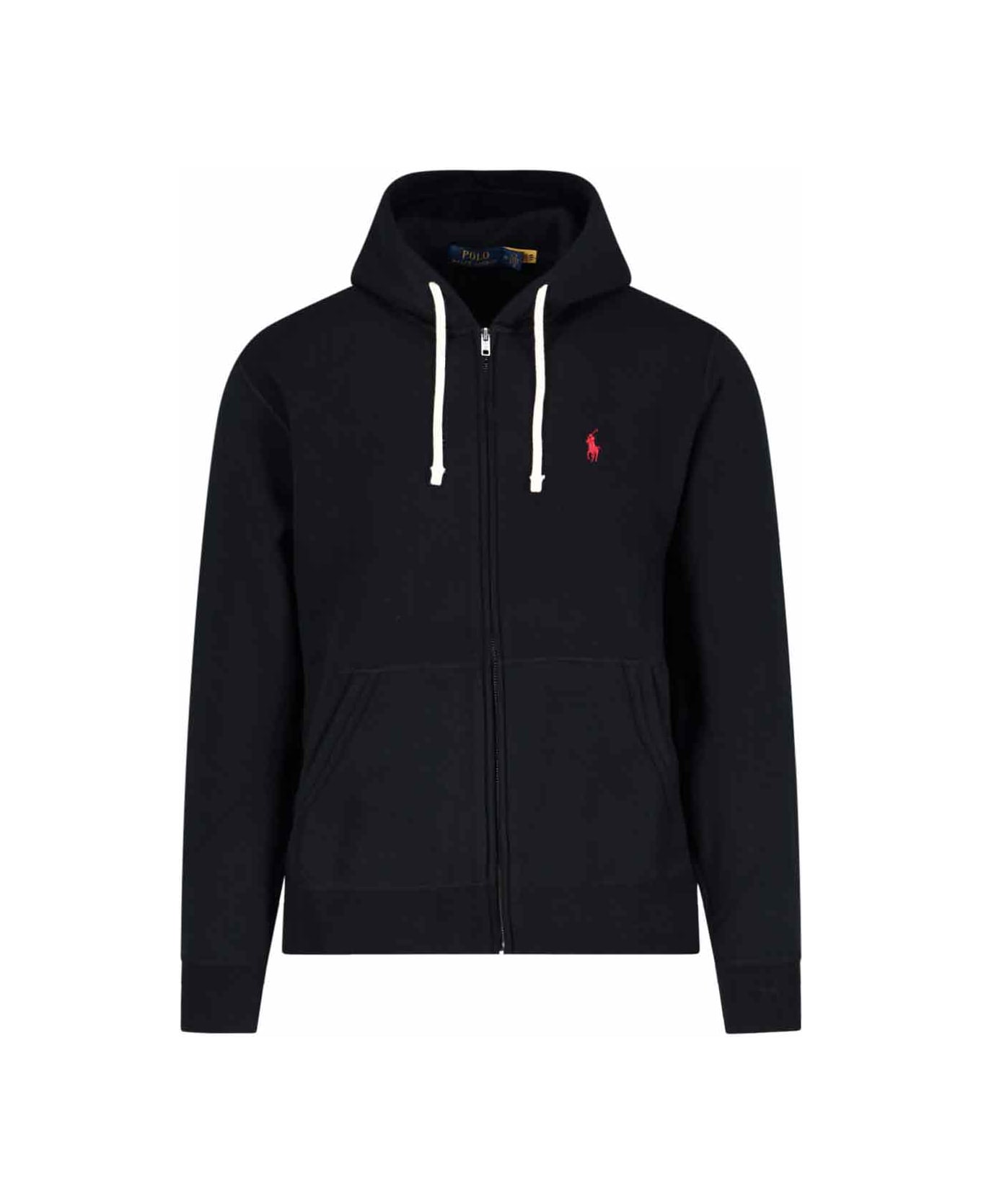 Polo Ralph Laurent zip sweatshirt in black cotton blend with white drawstring on the hood, zip closure, two side pockets, red logo embroidery on the chest and straight hem.