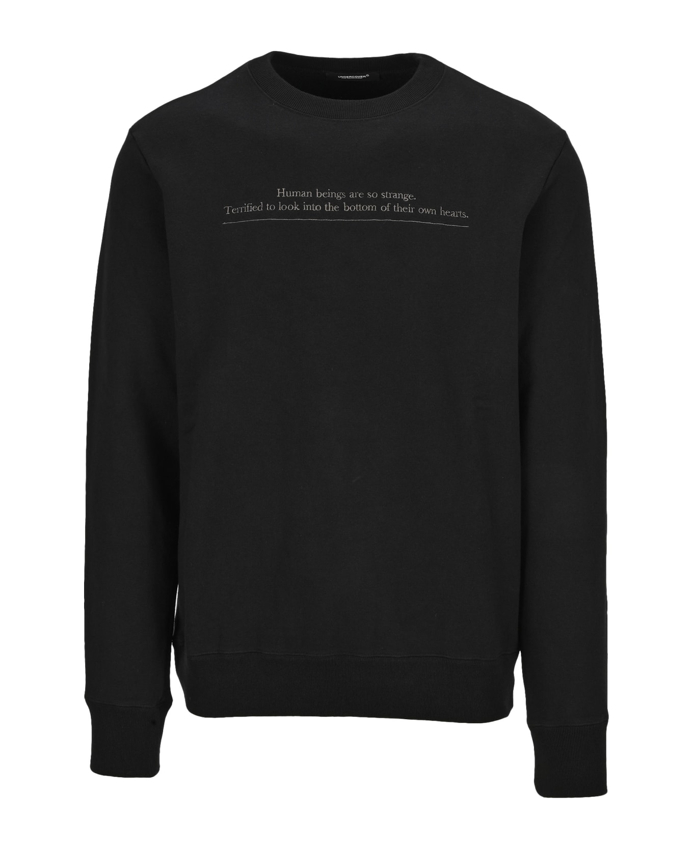 Black Cotton Slogan Sweatshirt By Undercover. Featuring: - Ribbed Crew Neck; - Slogan Print To The Front; - Large Embroidered Logo To The Back; - Long Sleeves; - Ribbed Hem And Cuffs.