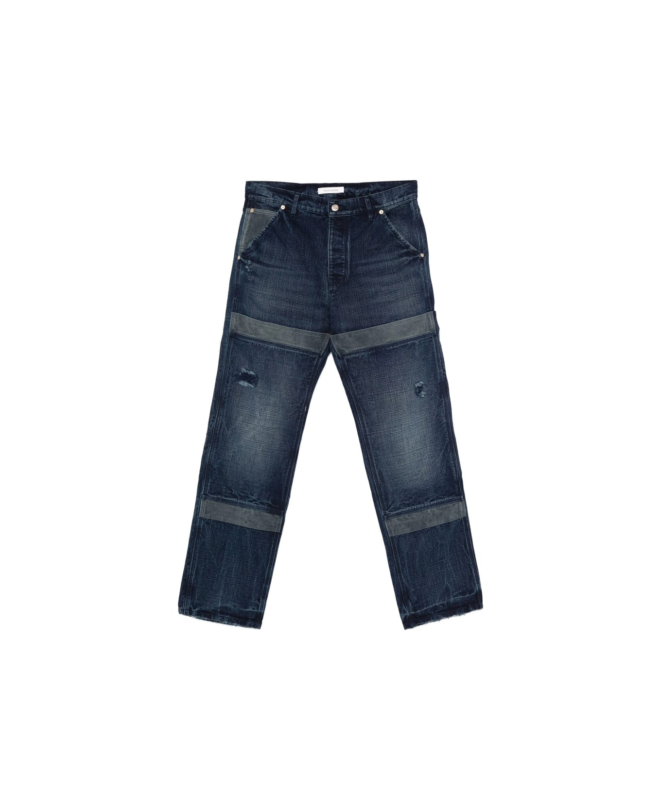 indigo blue panelled design distressed effect button fastening five pockets belt loops