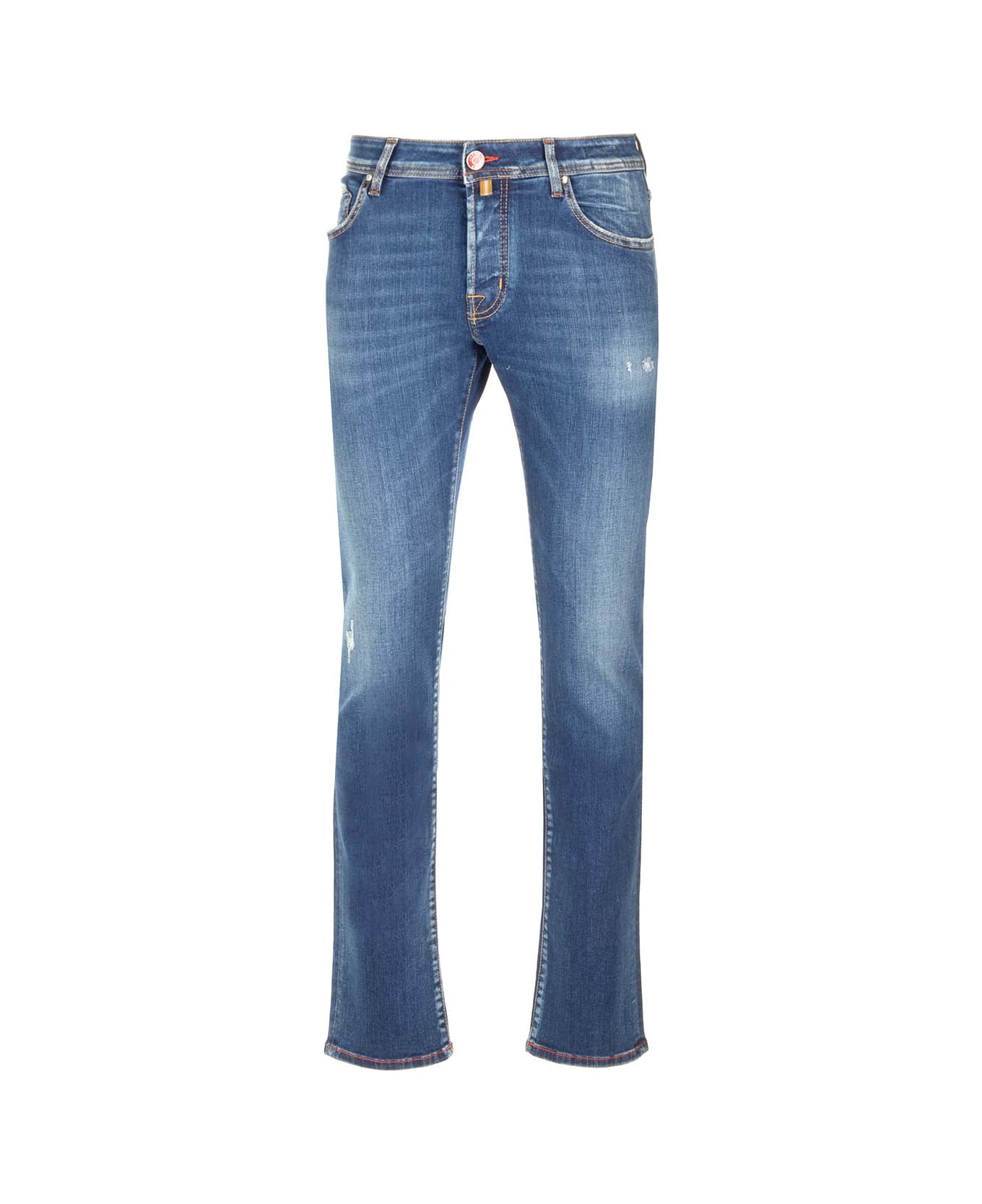 Slim fit 'Nick' jeans by Jacob Cohen in stonewashed denim with button, tassel and orange details, 5 pockets, straight and slim leg. Composition: 100% COTTON